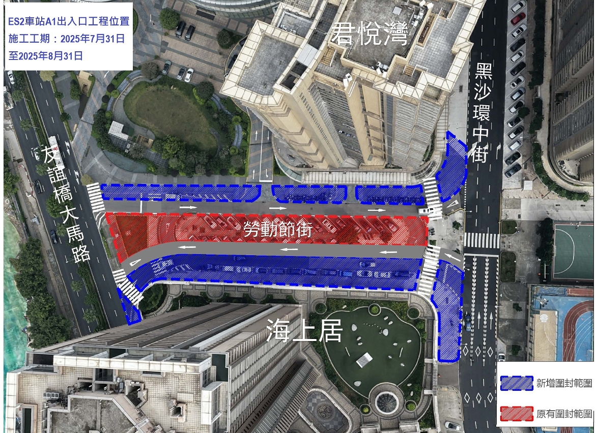 配合轻轨东站ES2车站A1出入口前期管线迁移施工,位于友谊桥大马路及黑沙环中街之间的一段劳动节街将于7月31日至8月31日调整围封范围,并实施有限度通车(详见附图)。因工程带来的不便,敬请市民及旅客谅解。