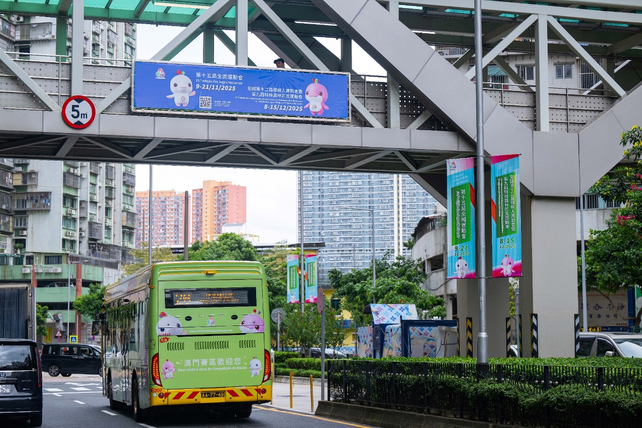 此外,澳门多条行人天桥及主要道路的灯柱旗帜已换上十五运会和残特奥会主题横额,多辆巴士亦换上吉祥物彩绘设计,成为城市流动宣传平台,让市民和旅客感受到运动会的活力与盛事气氛。