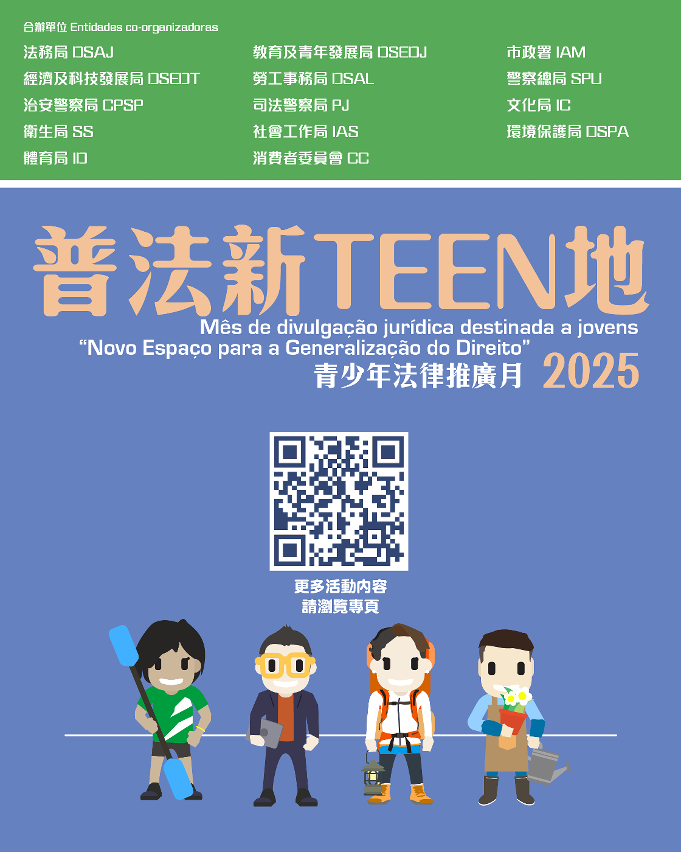 为持续提升青少年及市民大众知法和守法的意识,“青年政策”跨部门跟进小组成员(法务局、教育及青年发展局、市政署、经济及科技发展局、劳工事务局、警察总局、治安警察局、司法警察局、文化局、卫生局、社会工作局、环境保护局、体育局),连同今年特邀的消费者委员会,共14个政府部门将于9月至11月合办2025“普法新TEEN地”青少年法律推广月。期间将推出33项线上线下的普法活动,涵盖20余项法律主题。