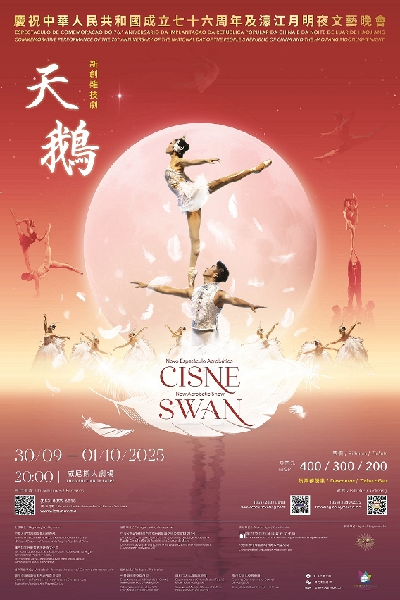 为与大众欢度国庆及喜迎中秋,“庆祝中华人民共和国成立七十六周年及濠江月明夜文艺晚会——新创杂技剧《天鹅》”将于2025年9月30日及10月1日晚上8时在威尼斯人剧场上演,门票于9月4日起公开发售。
