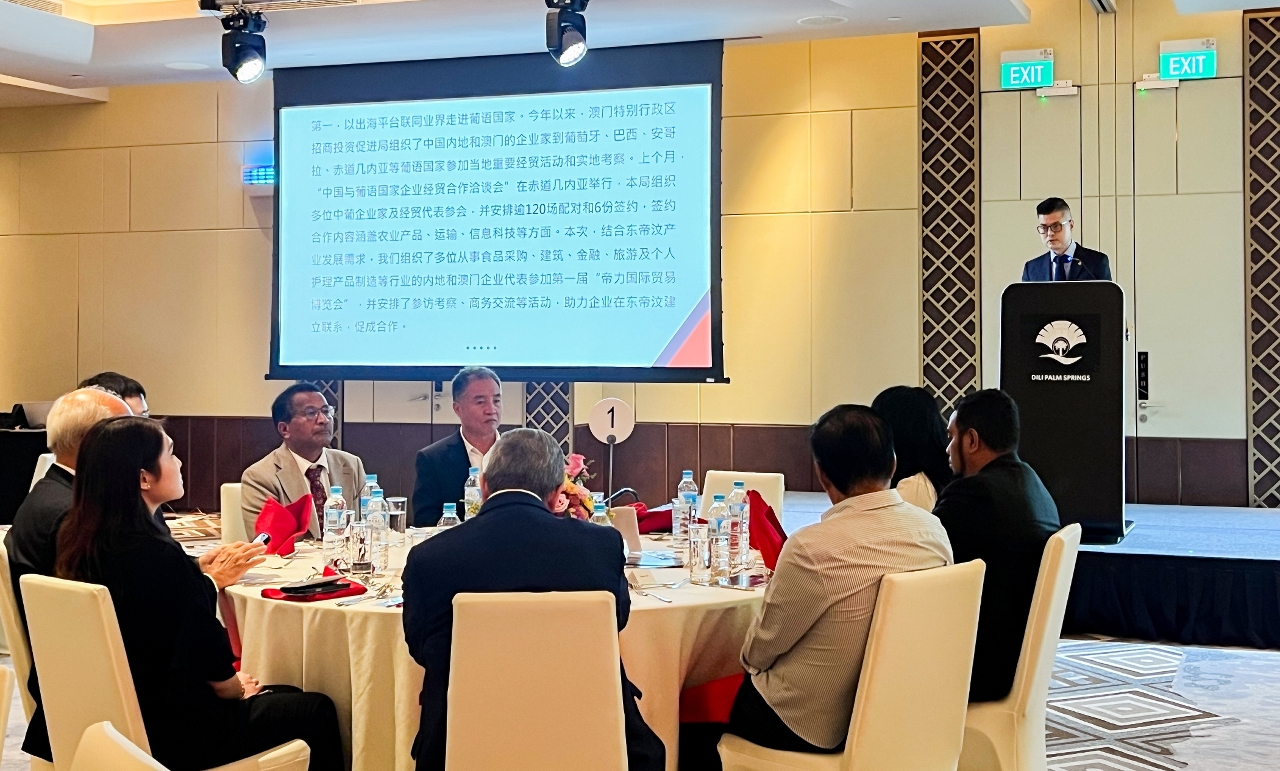 澳门招商局委员李藻森致辞时表示,澳门正持续丰富和提升中葡平台内涵,强化内联外通功能,积极推动中葡全方位、深层次、多领域合作。同时紧扣“澳门+横琴”的定位,以促进澳门经济适度多元发展为主轴,通过与澳门高度衔接的产业布局,为葡语国家企业创设更多投资机遇。李藻森诚邀东帝汶经贸机构及企业来澳参展考察,尤其欢迎参与将于10月在澳举办的“第二届中国—葡语国家经贸博览会(澳门)”,共探蓝色经济、农业产业等领域的合作潜力。
