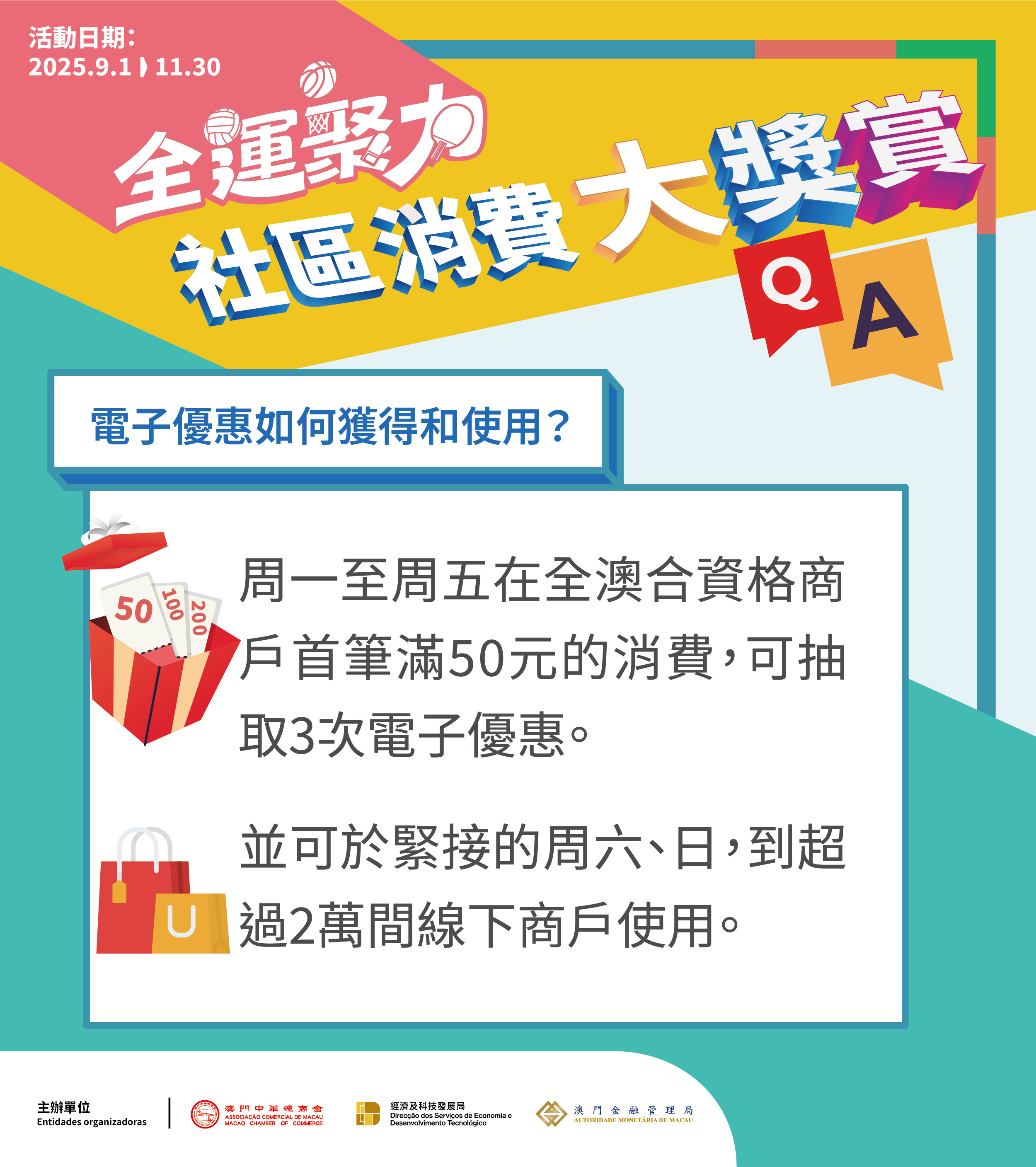 为提振消费市场信心,特区政府与澳门中华总商会藉着十五运会和残特奥会盛事,于9月1日至11月30日合办为期13周的“全运聚力・社区消费大奖赏”促消费活动。活动期间每周一至周五,经实名认证的电子钱包帐户,在合资格商户完成首笔满50元消费后,即可获得3次电子优惠抽取机会。
