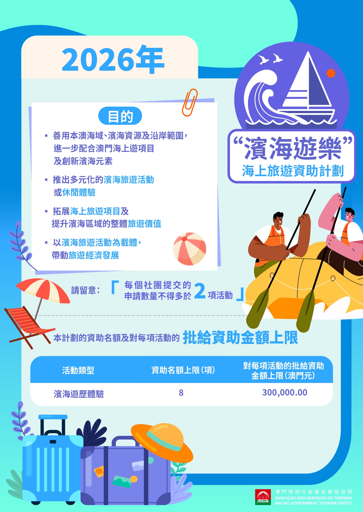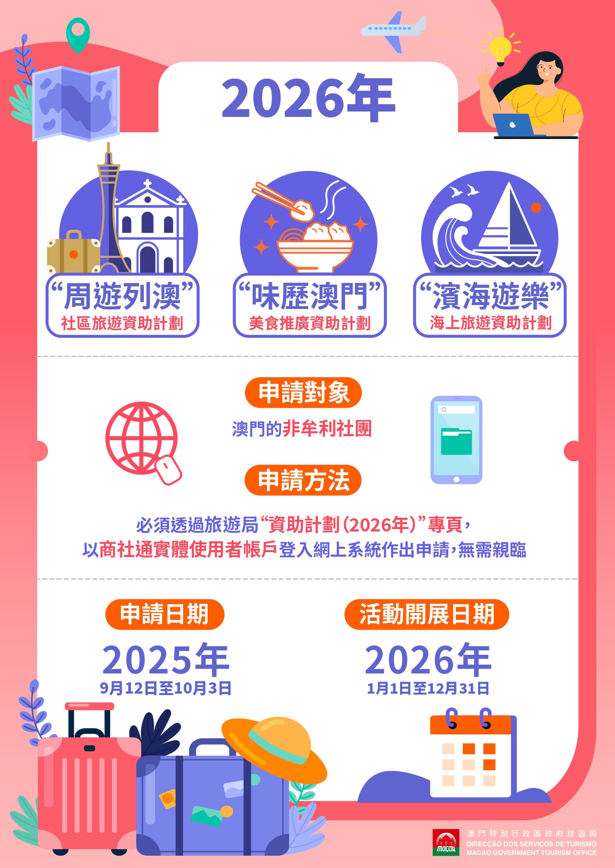 旅游局“周游列澳”社区旅游资助计划、“味历澳门”美食推广资助计划和“滨海游乐”海上旅游资助计划于2025年9月12日至10月3日接受申请,申请须以商社通实体使用者帐户登入旅游局“资助计划(2026年)”专页提交。旅游局将于9月11日举行线上讲解会,欢迎有兴趣的社团参加了解详情。