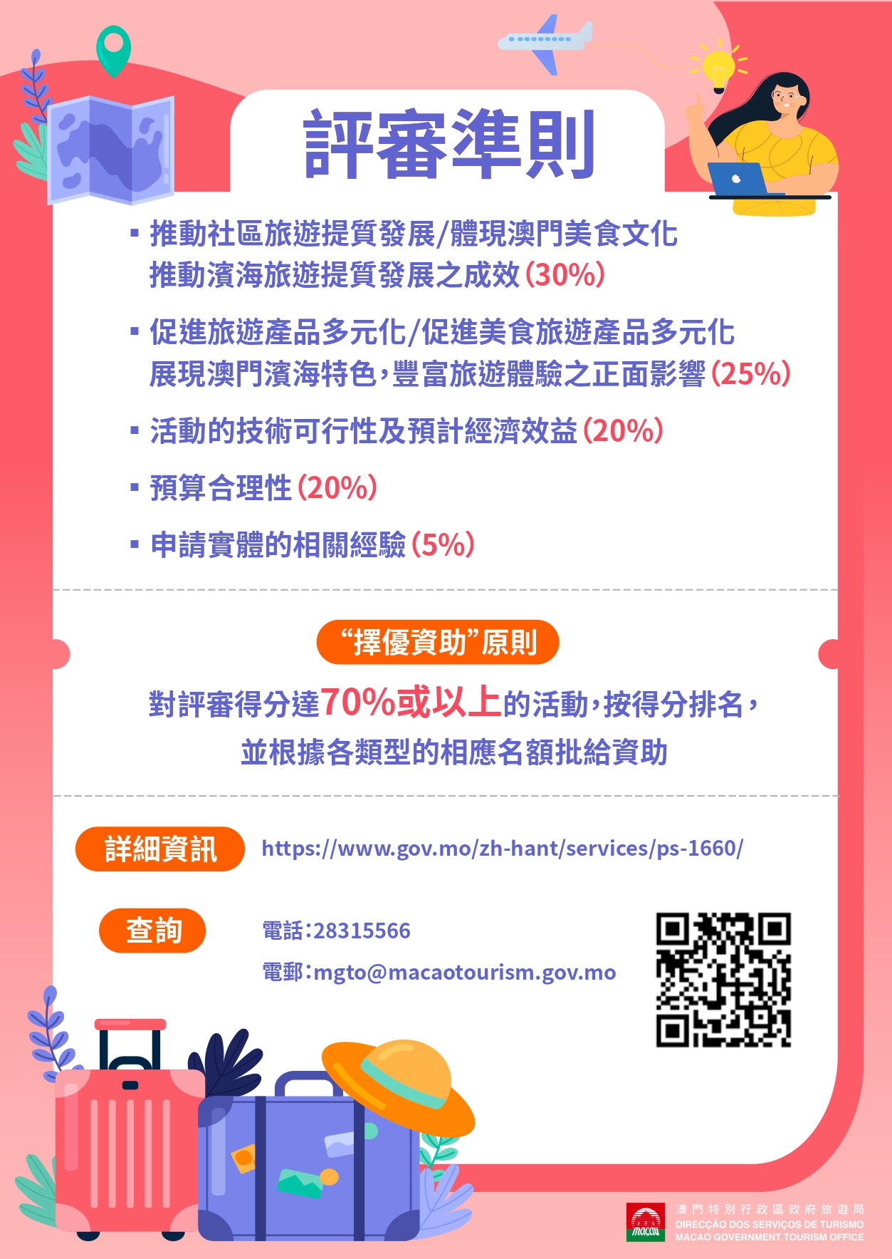 旅游基金就各资助计划制定了针对性的评审准则,以“择优资助”为原则,审慎评估及分析所有申请。有关2026年三项资助计划的申请详情,请浏览https://www.gov.mo/zh-hant/services/ps-1660/。