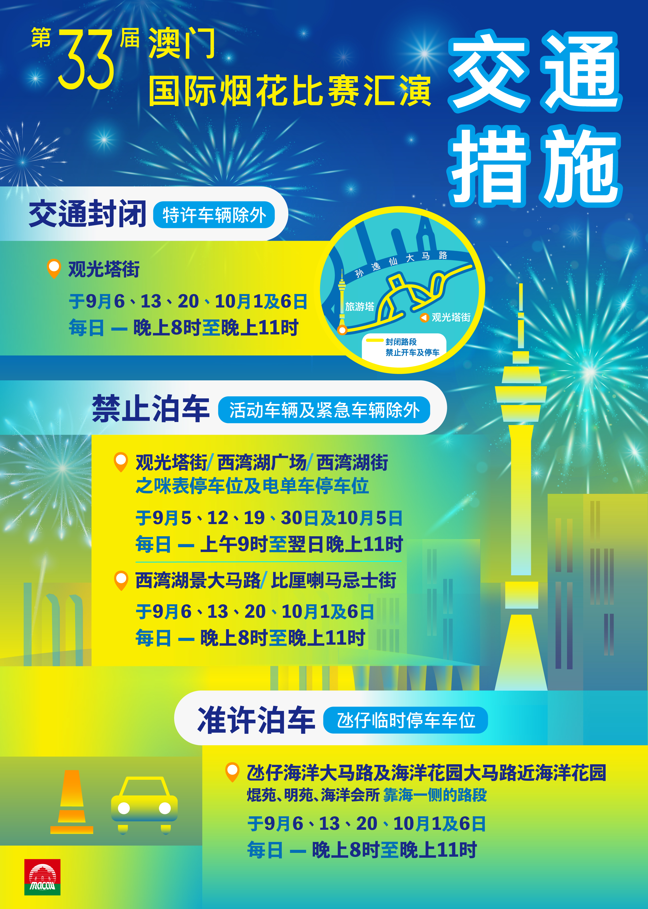 活动期间周边道路将实施临时管制,涵盖观光塔街、西湾湖广场、西湾湖街的咪表泊车位及电单车泊车位、西湾湖景大马路、比厘喇马忌士街、氹仔海洋大马路及海洋花园大马路近海洋花园,敬请公众留意相关安排。