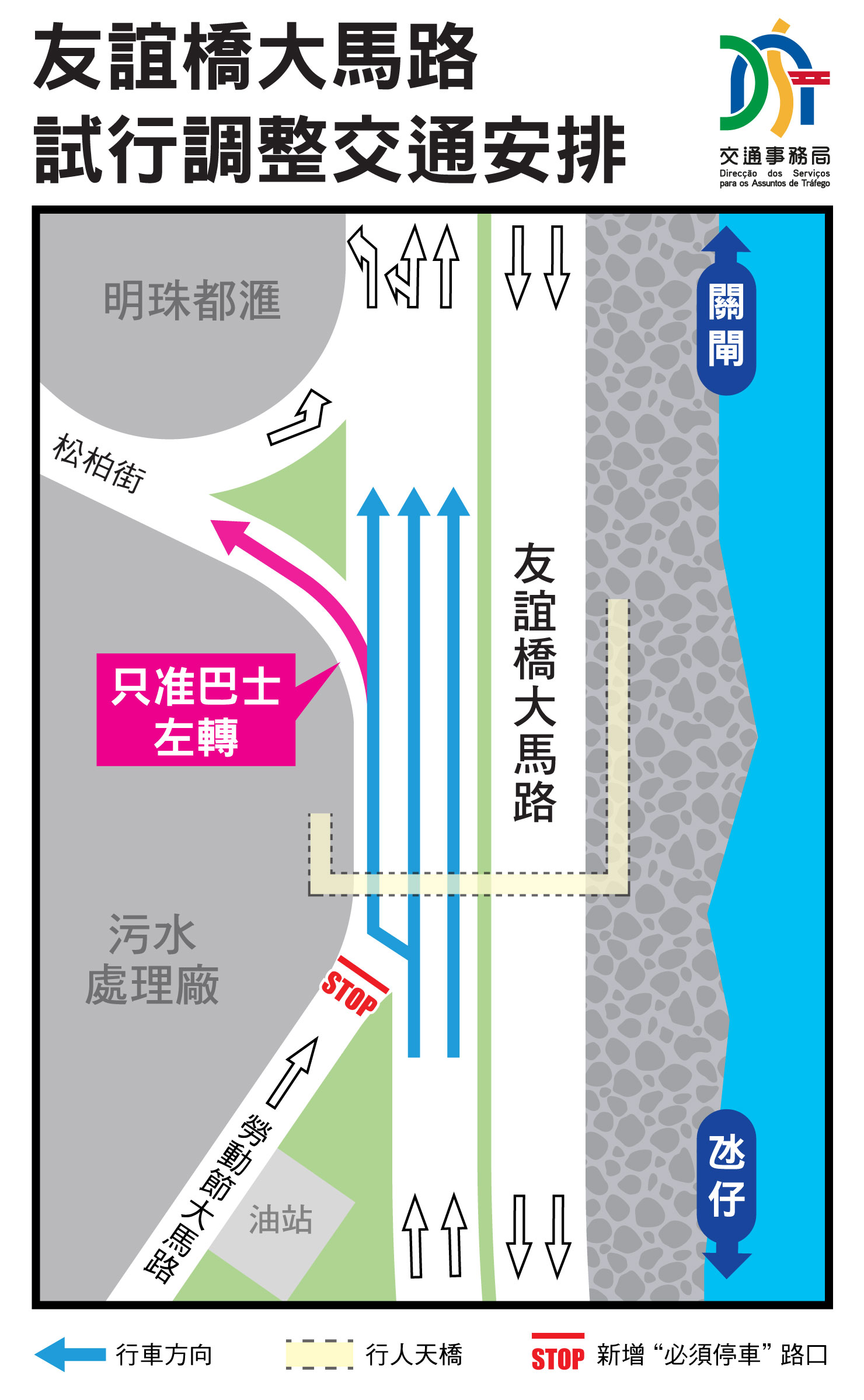 配合黑沙环新填海区P地段内松柏街的开通,为保障行车安全和顺理交通,交通事务局经检视和评估路况,以及听取交咨委的意见,试行调整该区部分道路的行车安排。当中,为降低劳动节大马路与友谊桥大马路交界的车流冲突,友谊桥大马路的车辆禁止左转进入松柏街(公共巴士除外);而由劳动节大马路往友谊桥大马路方向的路口增设“必须停车”的安排,并加设俗称“STOP”标志及标线。
