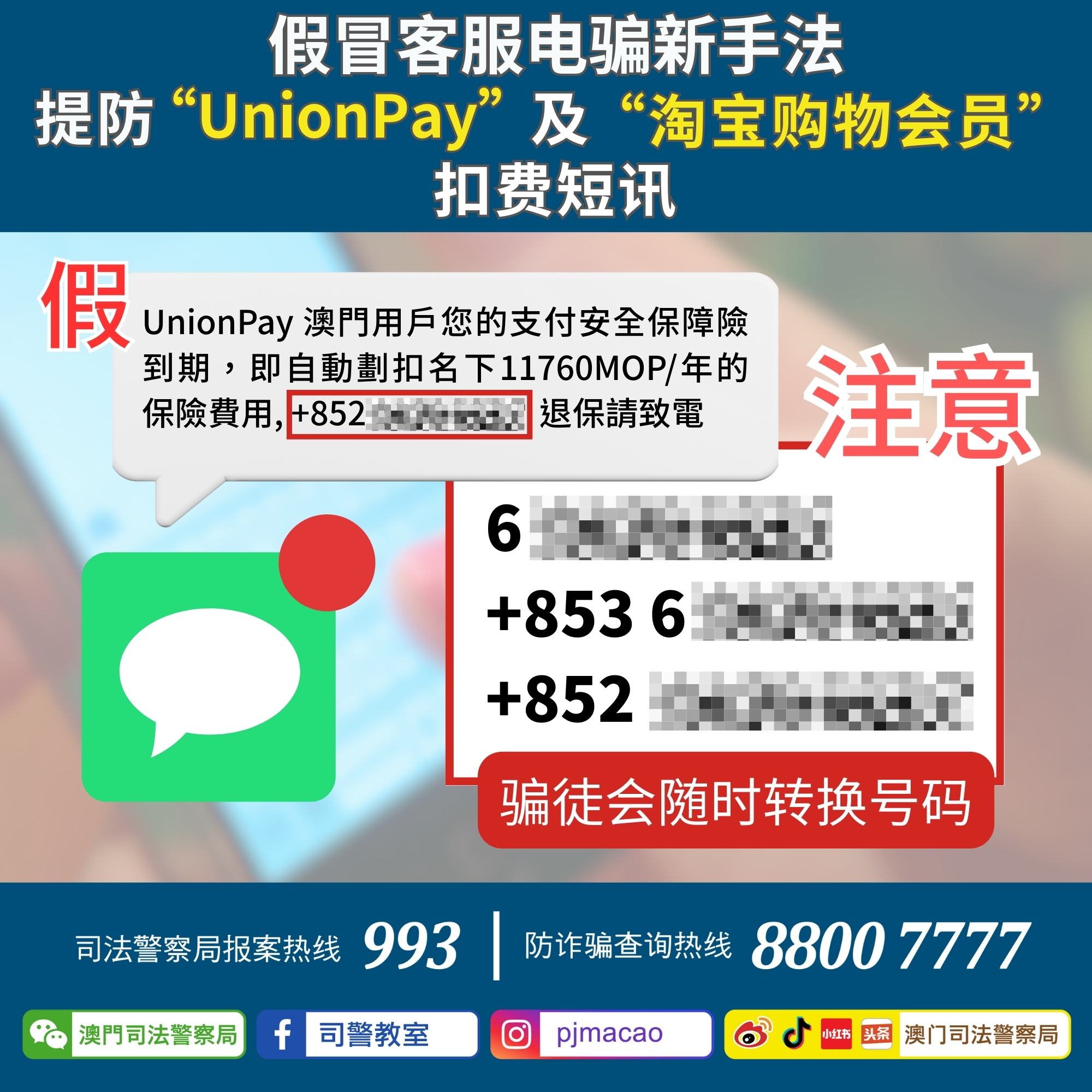 骗徒不断变换套路,由最初直接致电、到近日引入大量滥发诈骗短讯,加大行骗覆盖面诱使更多警觉性不足的市民误堕骗局;而骗徒所使用的电话号码亦五花八门,有6字开首及+853-6开首的本澳流动电话号码,甚至近日出现+852开首的电话号码;此外,邻近地区更开始出现假冒影音平台自动续费通知的诈骗短讯,公众必须加倍注意!
