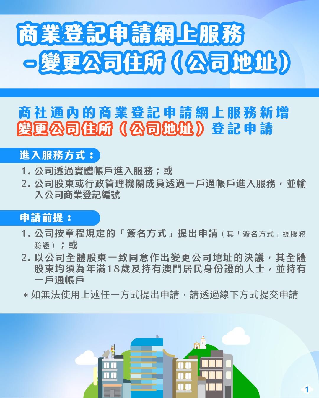 有意设立公司的人士可透过“商社通”提交公司设立的申请,并使用预设格式的线上文件模版制作公司设立的各类文件,无须再亲临公证署及登记局,即可轻松完成公司设立程序,提高企业开办效率。此外,变更公司地址也可透过“商社通”办理,包括提交申请、缴付登记费及取得登记副本,继续实现指尖办事模式,为用户带来最大便利。
