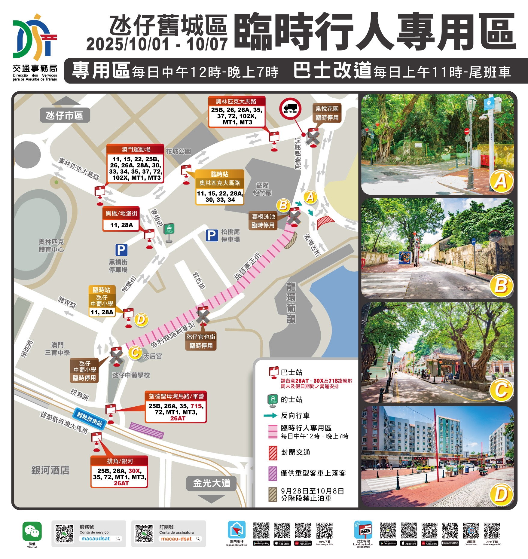 两个临时行人专用区于10月1日至7日每日中午12时至晚上7时实施,当中,氹仔旧城区实施之临时措施与过去相约,包括专用区范围及周边部份道路临时封闭交通、素啤古街部份路段反方向行车、区内咪表泊车位9月28日至10月8日禁止车辆停泊等(详情可参阅附表1)。巴士方面,一如既往于行人专用区实施期间的每日上午11时至尾班车期间实施巴士改道措施,市民及旅客可于巴波沙总督前地、邻近氹仔中葡小学设置的临时站乘搭11及28A路线,或前往奥林匹克大马路或望德圣母湾大马路(近轻轨排角站)的巴士站点,乘搭多条巴士路线来往各区,其中包括于假期增开的26AT巴士路线。详情可参见附表2及留意两巴网站( www.tcm.com.mo 及 www.transmac.com.mo )