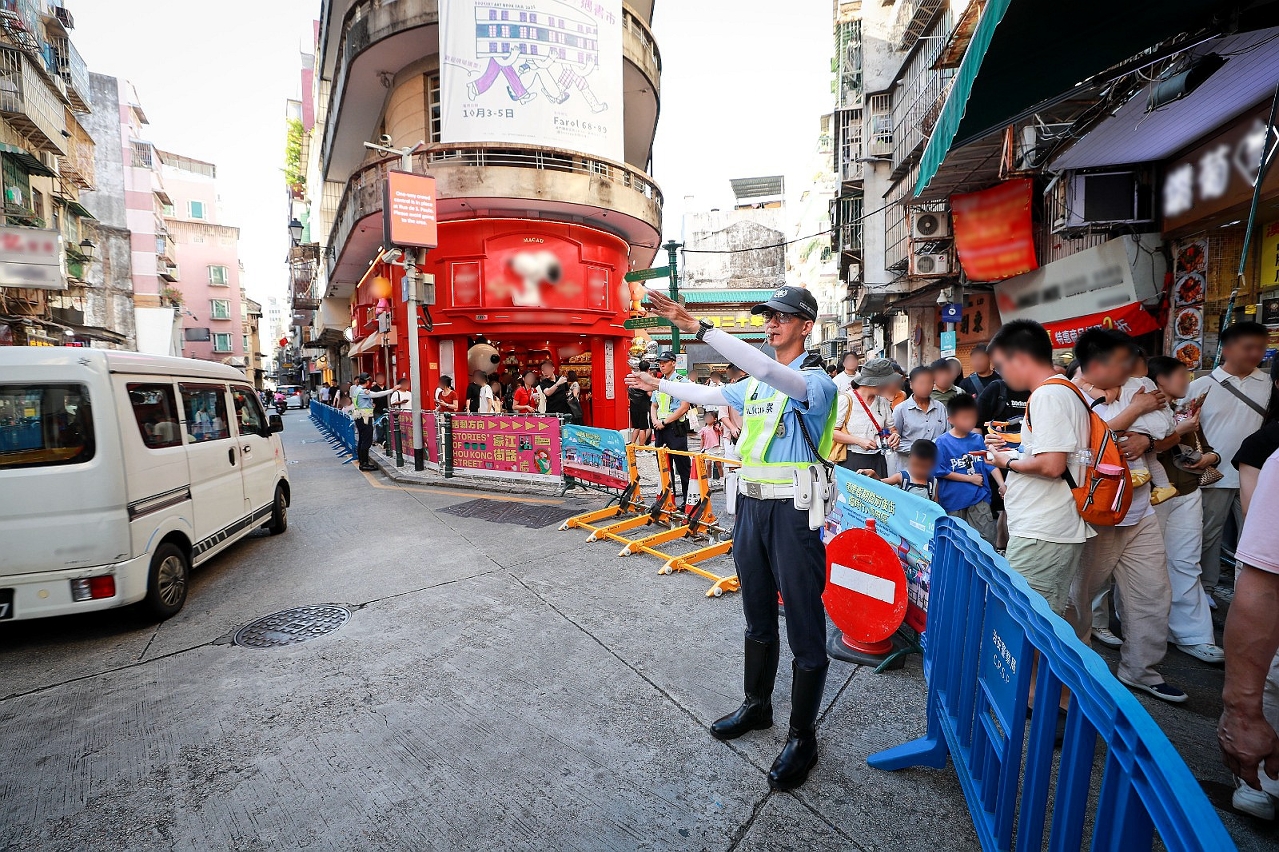 节假日期间,本澳新马路、大三巴、氹仔旧城区及金光大道等主要旅游热点游人如织。治安警察局根据现场人流变化动态调整警力部署,分别于10月2日、3日及4日下午在大三巴短暂实施人潮管制措施;而为配合氹仔旧城区及关前后街于节日期间设立临时行人专用区,在10月1日至10月7日中午12时至晚上7时在上述两个区域及周边道路实施临时交通管制措施;实施上述措施期间,市民及旅客均积极配合现场警方指示有序行进,整体秩序良好。