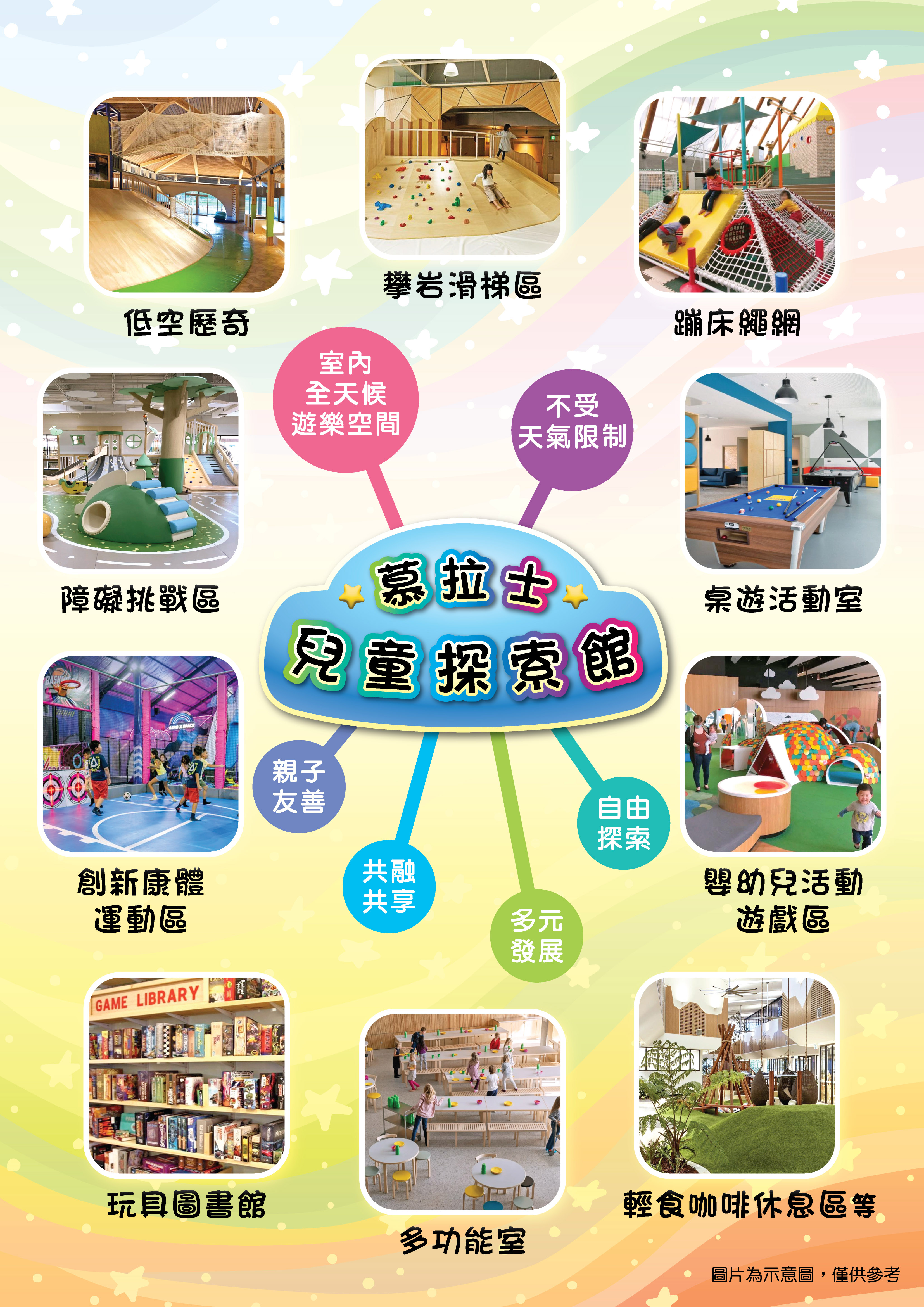 一楼总面积约3,000平方米,计划分六大区块,游戏设施对象年龄段为0至12岁,计划设施包括低空历奇、攀岩滑梯区、爬网、滑梯障碍挑战区、婴幼儿活动游戏区、工作坊、多功能室、桌游室、玩具图书馆及轻食咖啡休息区。二楼总面积约3,500平方米,计划分五大区块,游戏设施对象年龄段为6至18岁,设施包括蹦床乐园、探索网道、康体挑战区、创新康体运动区及桌游活动室等。