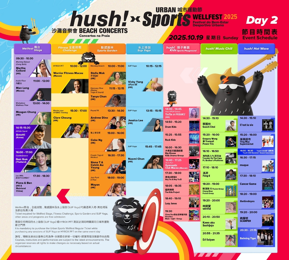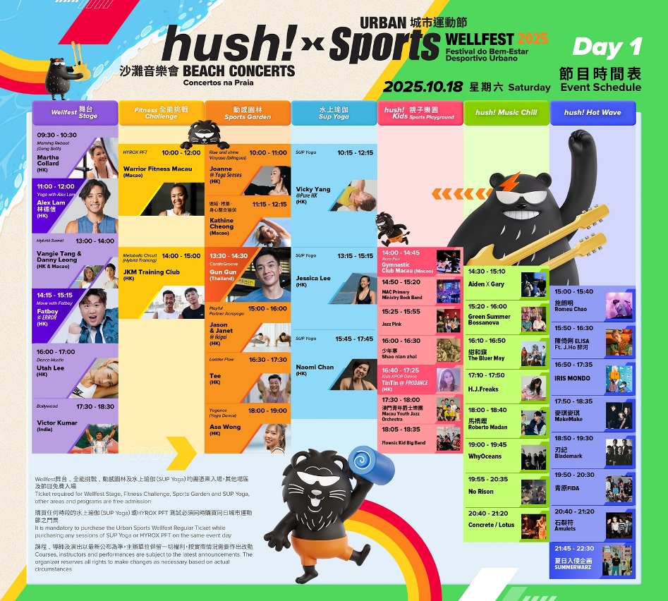 “hush! 沙滩音乐会 x 城市运动节”主活动将于10月18日及19日在黑沙海滩及黑沙临时休憩空间举行,设有“Hot Wave”、“Music Chill”、“hush! Kids亲子乐园”、“Wellfest舞台”、“动感园林”及“全能挑战”六大舞台,一连两日从早到晚带来马拉松式的音乐演出和运动课程。现场更设有水上瑜伽、音乐剧亲子巡游、音乐萤光跑、艺术装置、美食及文创市集、乐器体验及工作坊等丰富周边活动,回应市民及旅客的不同喜好和需要,共同感受澳门中西荟萃的文化特色,打造澳门作为中西文明交流互鉴的重要窗口。