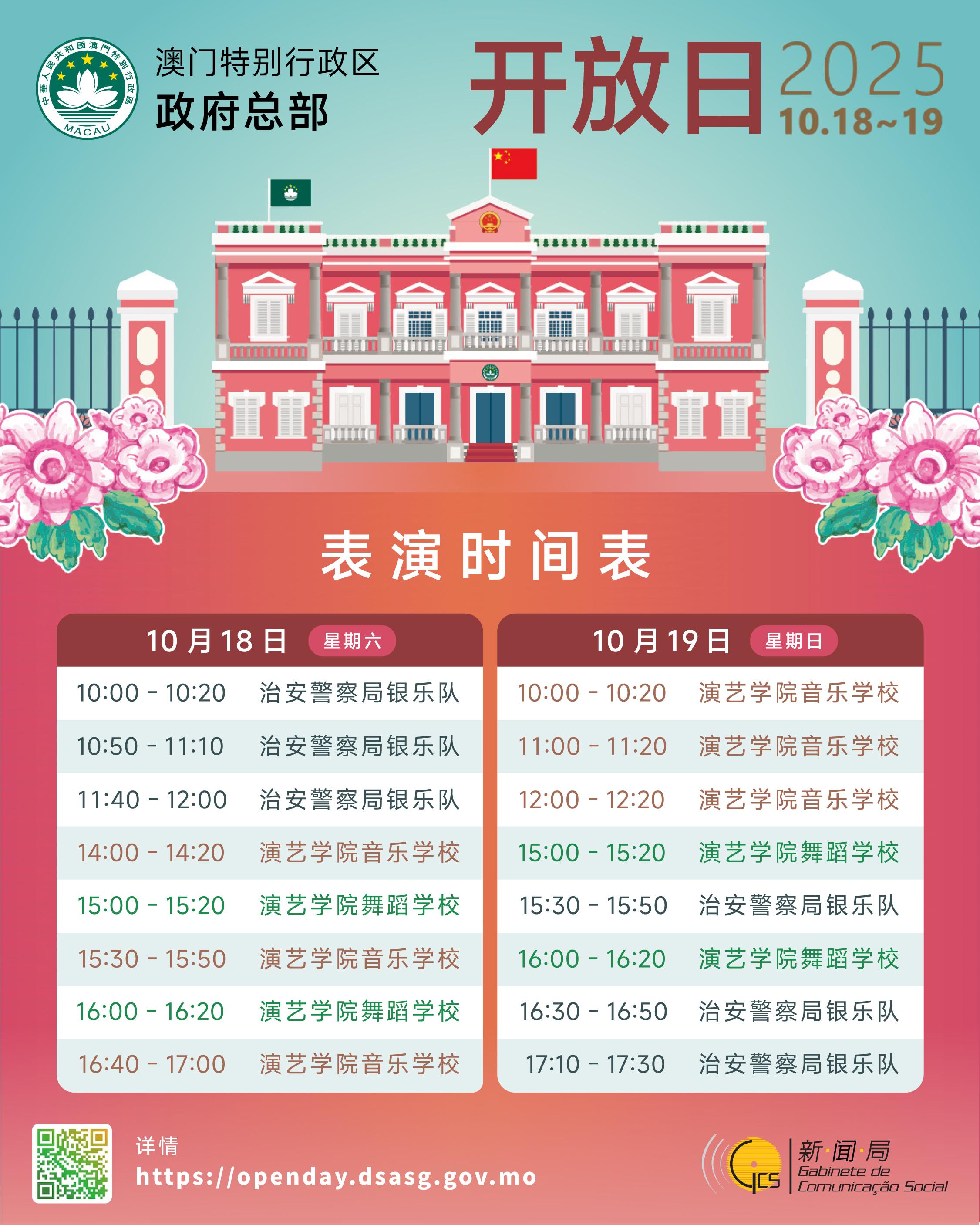 表演节目方面,治安警察局银乐队、演艺学院音乐学校和舞蹈学校学生将于两天开放日的指定时段,为公众呈献乐器演奏及舞蹈表演。邮电局继续在政府总部对面的南湾湖畔设置临时柜枱,提供加盖纪念邮戳的服务,并发售相关邮品。