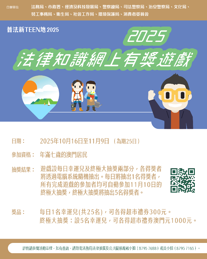 为推广青少年法治教育,法务局与市政署、经济及科技发展局、警察总局、司法警察局、治安警察局、文化局、劳工事务局、卫生局、社会工作局、环境保护局及消费者委员会共12个政府部门合办“普法新TEEN地青少年法律推广月活动”,并由即日起至11月9日期间推出法律知识网上有奖游戏。是次活动对象为年满七岁的澳门居民,旨在以寓学习于娱乐的方式,透过网上问答游戏提升青少年及公众学习法律的兴趣,加深他们对《宪法》、《基本法》、《维护国家安全法》、《道路交通法》、《预防及控制未成年人饮用酒精饮料制度》、《消费者权益保护法》、《动物防疫法》、认识国家象征和标志等法律法规的认识。