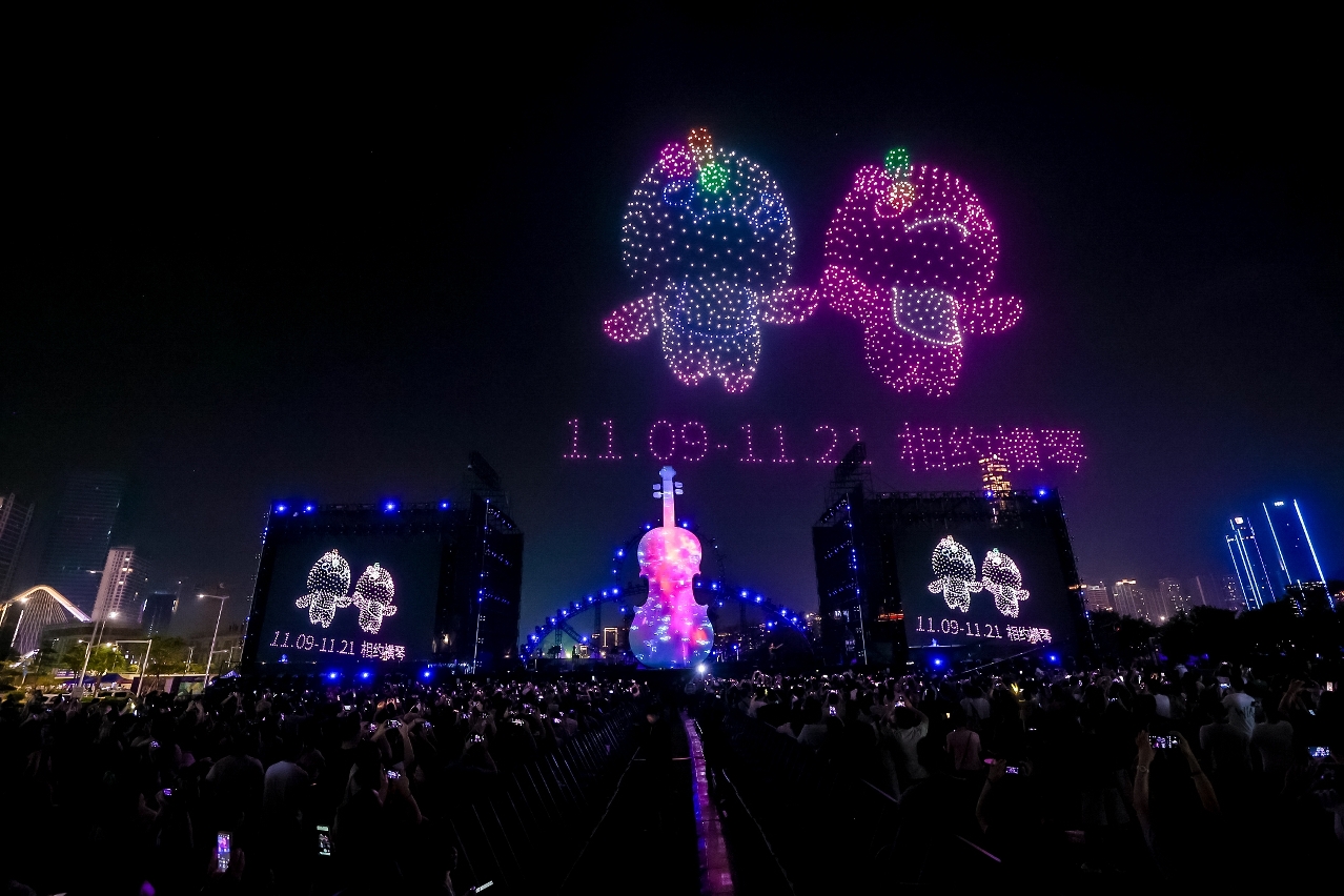 现场定制一把高达20米的“小提琴”艺术装置,在白天作为景观供打卡拍照,夜晚则结合光影效果,成为演出的核心载体。2000架无人机于十字门水道上方升空,形成了约3万平方米的“空中光影剧场”,依次呈现出粤港澳大湾区地标建筑、横琴天沐琴台、澳门特色街巷、横琴和澳门赛区承接的体育赛事项目、十五运会吉祥物等图案,展现出横琴与澳门共同筹备盛事的热情与创意。