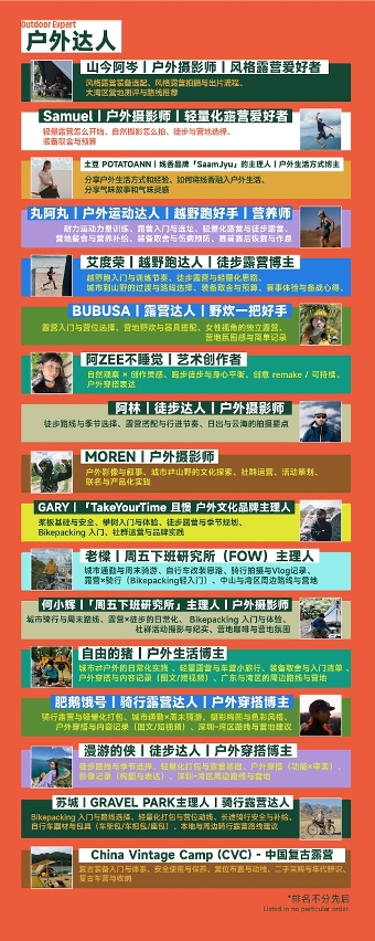 活动现场还专设玩家创意区,特邀17位户外领域资深玩家,围绕户外摄影、风格露营、轻量化徒步、骑行露营、越野跑等作主题分享,放送装备选配、路线规划、野炊料理等户外实用技巧。