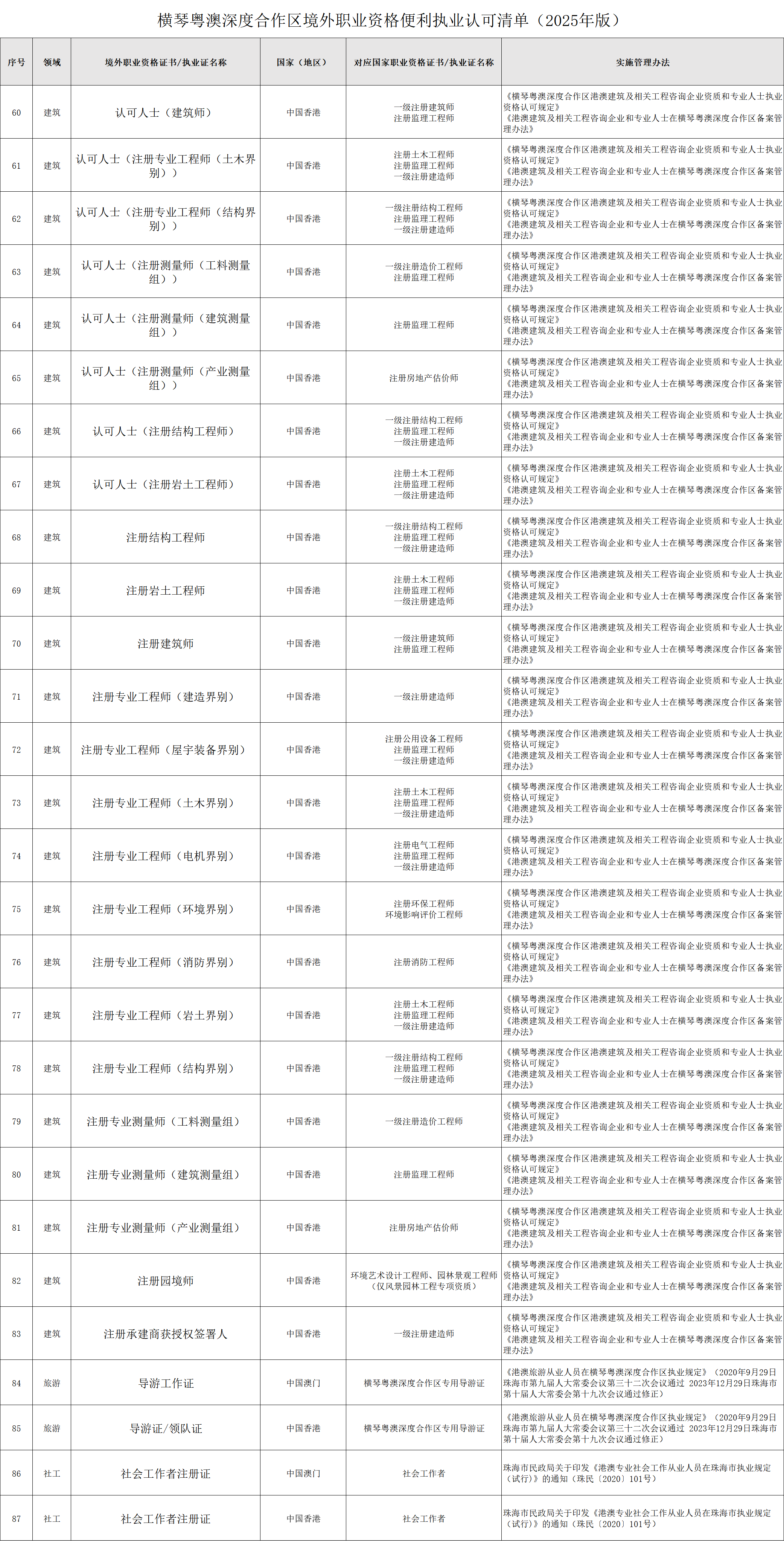 《清单》涵盖法律、金融、会计、税务、药学、医疗卫生、建筑、规划、旅游、社工10个领域,包括律师、证券从业人员、会计师、税务师、土木工程师等87项职业资格,其中有49项为澳门职业资格,进一步拓宽了澳门专业人士在合作区的执业空间。