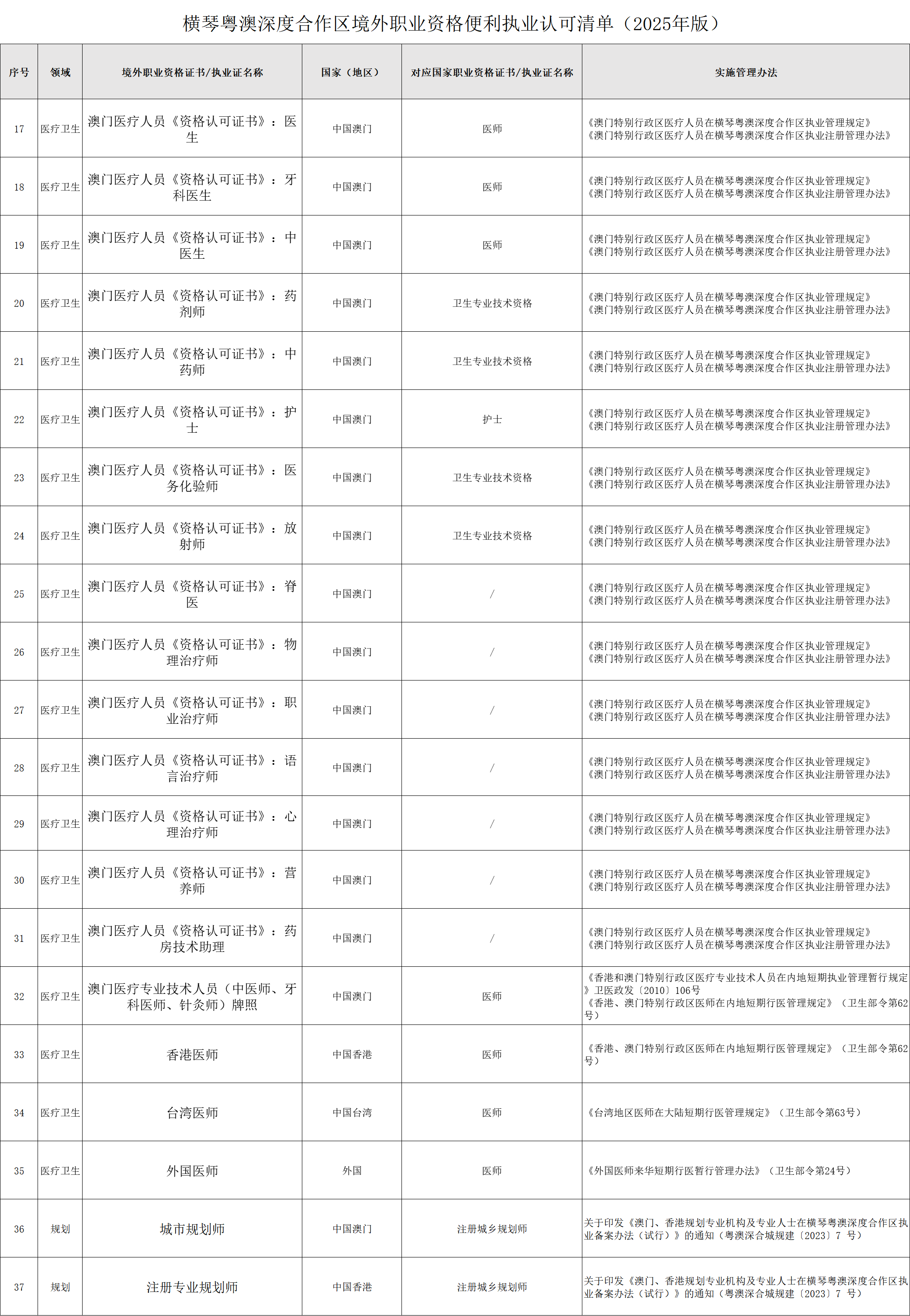 近日,横琴粤澳深度合作区经济发展局发布《横琴粤澳深度合作区境外职业资格便利执业认可清单(2025年版)》(下称《清单》),允许持有《清单》内境外职业资格的专业人员按照相关实施办法,通过执业备案、登记、专业科目免考等途径,在合作区提供专业服务。《清单》的发布是合作区与澳门规则衔接的重要体现,助推人才创新要素跨境流动,为琴澳一体化发展提供人才支撑。