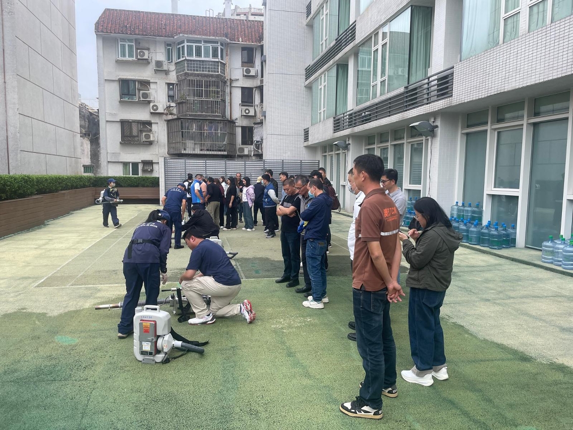 是次培训课程透过系统化的理论培训与实操练习相结合,内容包括:1、讲解操作人员应佩戴的安全防护装备,确保在使用药物及机器过程中保障个人安全;2、介绍灭蚊机器及药物的种类与特性,以了解不同设备的功能与适用场景,以及喷洒的最佳时机;3、系统说明灭蚊操作流程及注意事项,以掌握标准作业方法;4、由专业人员现场示范超低容量喷雾机及热雾机的操作,又安排分组实操,通过实境练习确保受训人员熟练掌握灭蚊设备操作及喷洒技巧,提升其化学灭蚊的实战能力。