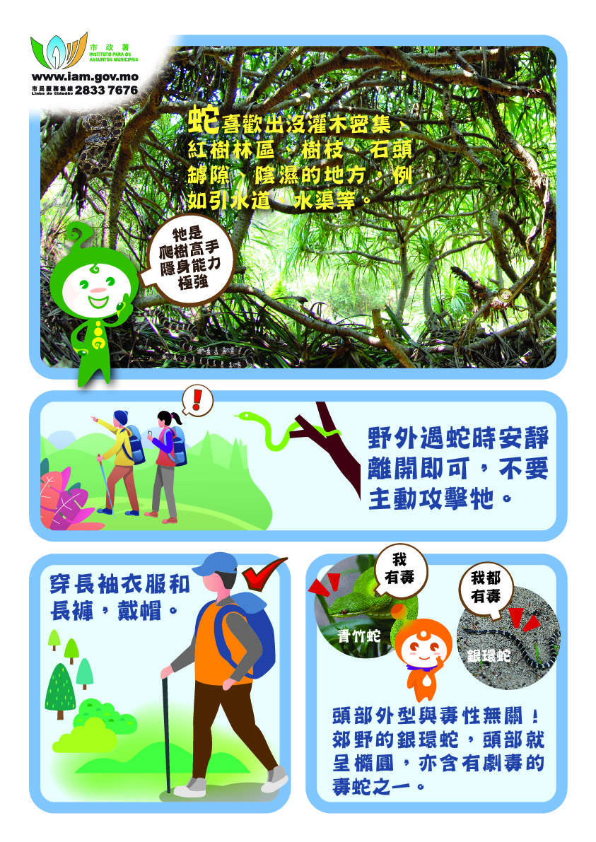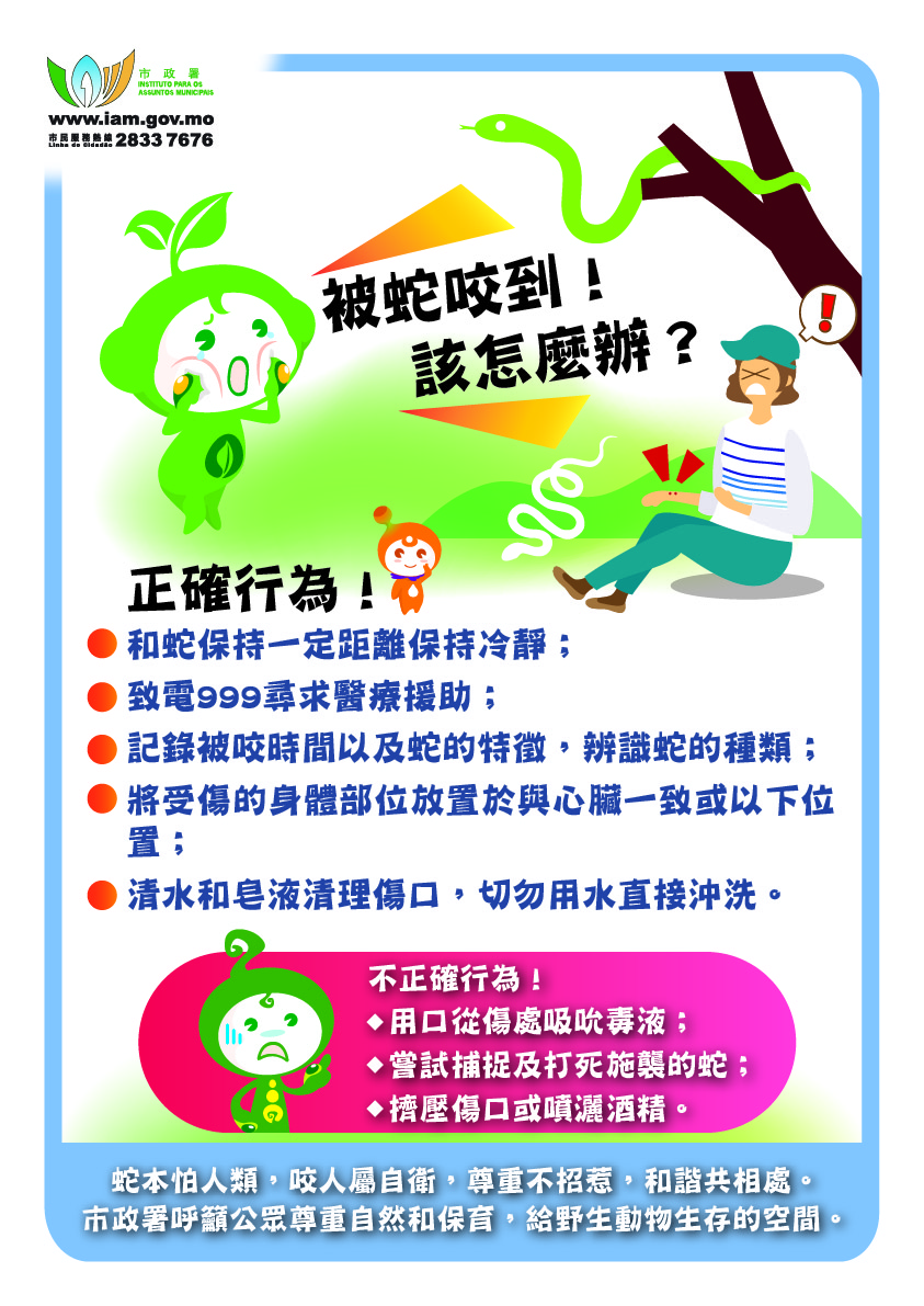 行山郊游时如遇见蛇,应保持镇定安静,以免令蛇类感到受威胁。一般蛇类遇到威胁时,会作出虚张声势的防御姿态,但极少主动攻击。因此,野外遇蛇时安静离开即可,毋须刻意将其驱离,更不要对蛇作出伤害。如不幸被蛇咬伤,应保持冷静,与蛇保持一定距离以防再次被咬,并记录被咬时间以及蛇的特征,同时须避免剧烈活动,尽快求救和致电999求助。