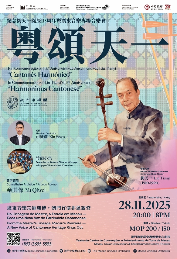 为纪念粤乐大师刘天一诞辰115周年,澳门中乐团将举办《粤颂天一》广东音乐专场音乐会。音乐会原定在11月29日(周六)于岗顶剧院上演,现更改为11月28日(周五)晚上8时,移师至澳门旅游塔会展娱乐中心剧院举行。音乐会由香港青年指挥家司徒健执棒,联同香港着名室内乐团“竹韵小集”共同演出,并特邀刘天一弟子、当代粤乐大师余其伟担任艺术顾问。