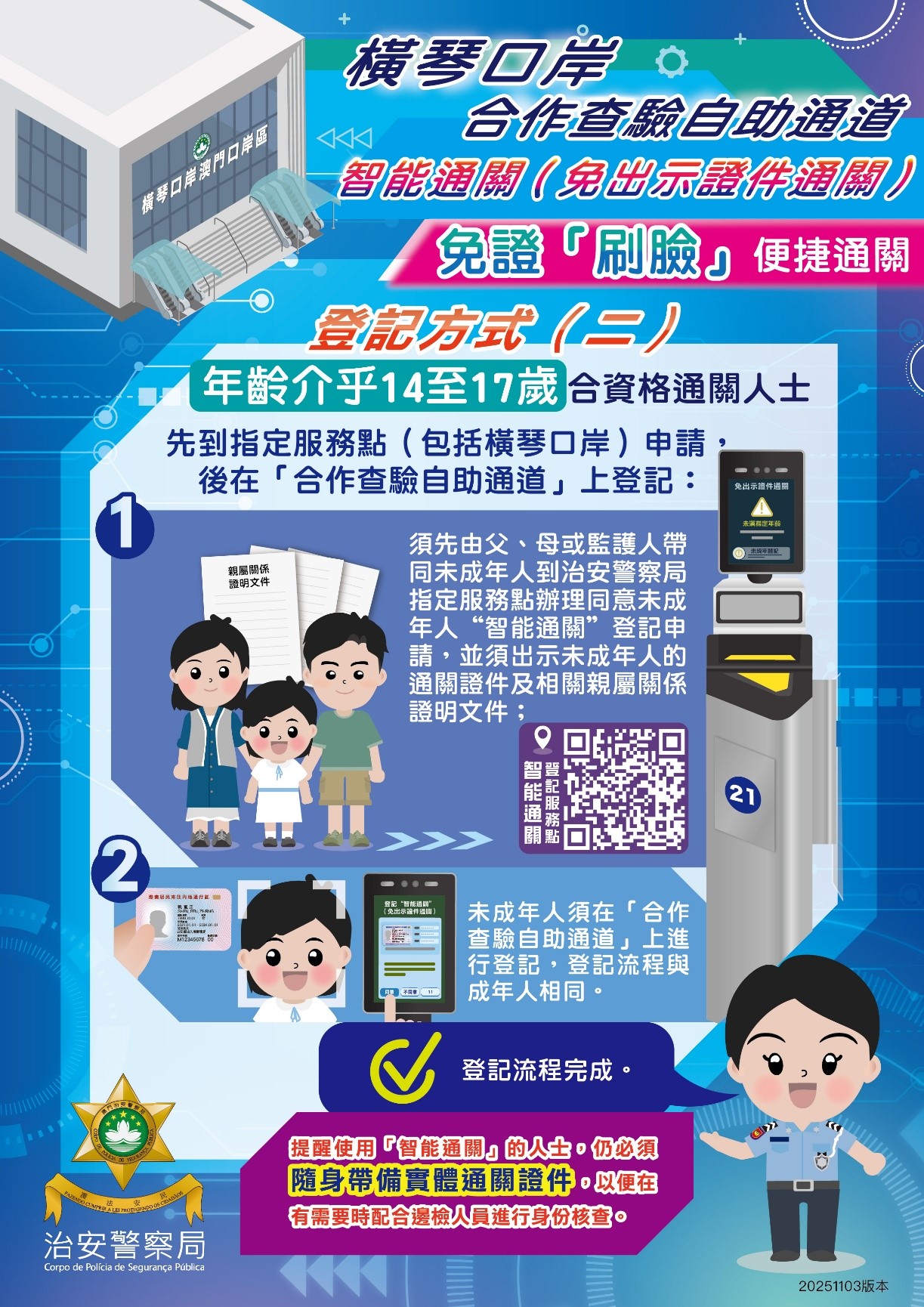 为保障未成年人跨境出行安全,年龄介乎14至17岁之未成年人,倘有意使用横琴口岸「智能通关」措施,须先由父、母或监护人带同未成年人到治安警察局指定服务点(包括横琴口岸,详见下表)办理同意未成年人「智能通关」登记申请,并须出示未成年人的通关证件及相关亲属关系证明文件。