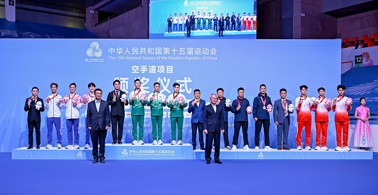 『第十五届全国运动会』今(6)日在澳门赛区进行空手道项目,坐拥主场优势的澳门队首日比赛即传来喜讯,郭建恒(KUOK KIN HANG)继2021年西安全运会勇夺个人型铜牌,为澳门夺得历史性奖牌后,今届伙拍队友郑沘珞(CHEANG PEI LOK)及方文浩(FONG MAN HOU)在男子组团体型再造出好成绩,决赛以42.7分击败香港队摘金,为澳门参加全运会以来首面金牌。澳门特别行政区行政长官岑浩辉出席颁奖礼,亲自为澳门运动员颁发奖牌。