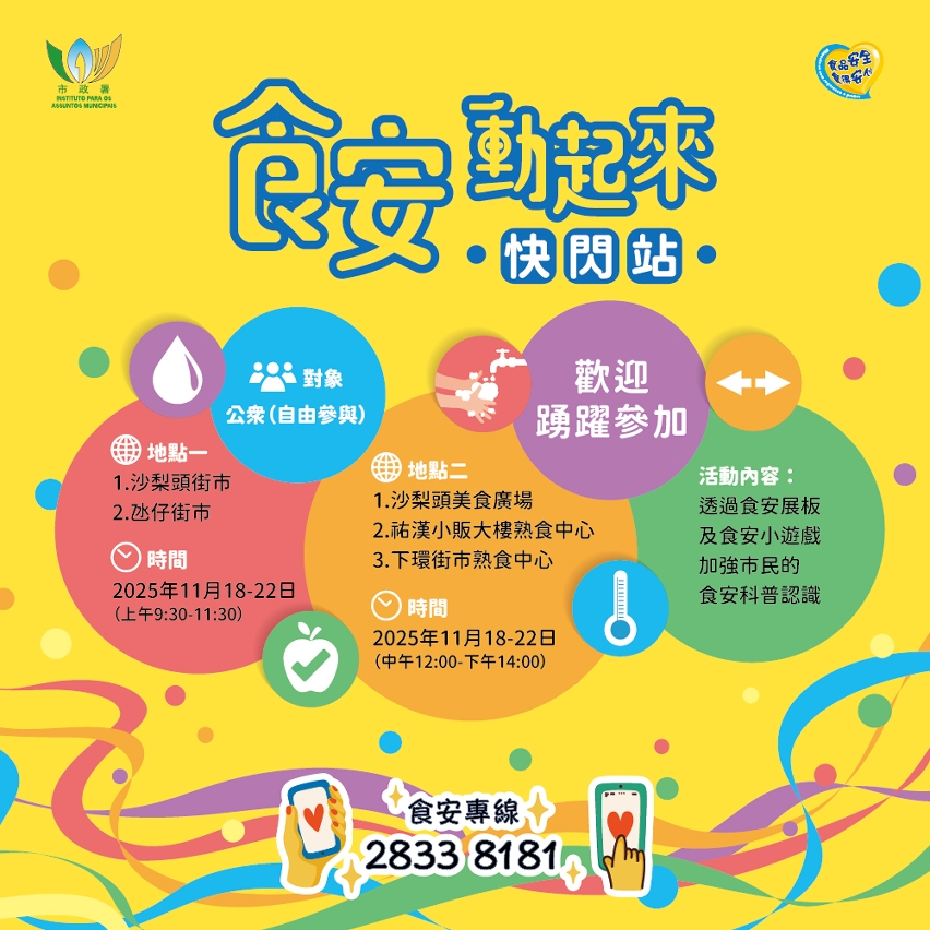 市政署持续于社区推广食品安全知识,将于11月18日至22日期间,在本澳街市及熟食中心设置“食安动起来快闪站”,透过轻松有趣的互动游戏,向市民传递秋冬季节的食品安全要点,欢迎市民到场参加。