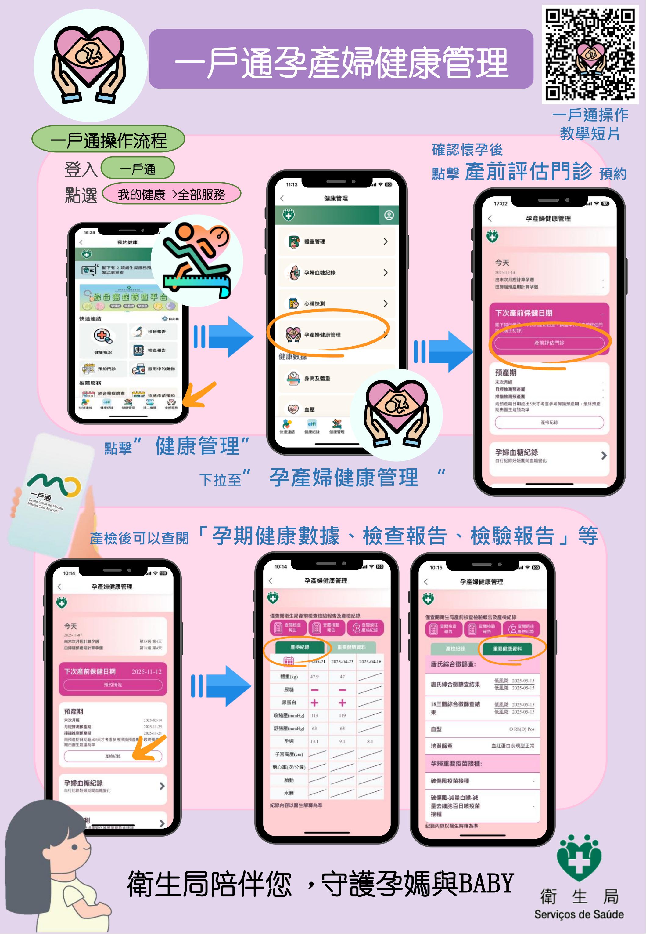 为贯彻特区政府构建生育友善环境的施政方针,优化资源配置,卫生局自今(22)日起在“一户通”内推出孕产妇健康管理平台,为孕产妇提供一站式全孕周期的综合健康管理服务。该健康管理平台涵盖以下5大重点内容: