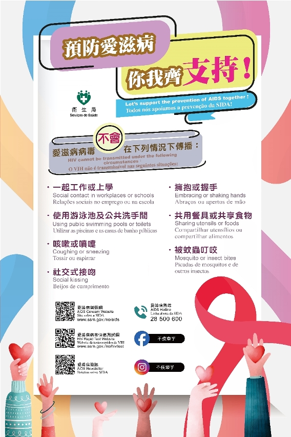 为响应12月1日“世界爱滋病日”,落实《健康澳门蓝图》迈向“终止爱滋病流行”的目标,卫生局以“资源下沉”、“关口前移”、“观念转变”三大政策方向,透过“健康社区”计划推动爱滋病“三早”措施,即 “早发现、早诊断、早治疗”,提升居民对预防爱滋病的认识和整体健康水平。