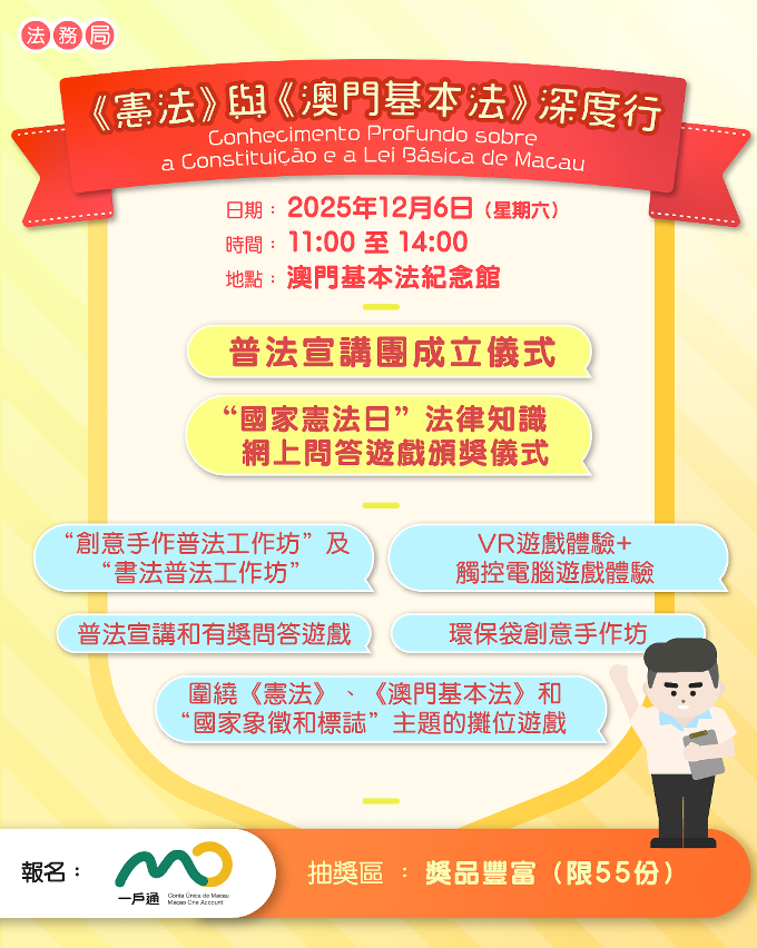 为进一步扩大普法覆盖面,法务局将于12月6日(星期六)上午11时至下午2时在澳门基本法纪念馆举办“《宪法》与《澳门基本法》深度行”活动。活动当日将同步举行“普法宣讲团成立暨法律知识网上问答游戏颁奖仪式”,并设有多项趣味普法活动,包括普法工作坊、摊位游戏、环保袋创意设计手作坊、VR游戏、触控电脑游戏、有奖普法问答游戏及导赏等,适合不同年龄人士参与。参加者只需完成指定数量的工作坊及摊位游戏,即可获一次抽奖机会,奖品丰富,数量有限,送完即止。