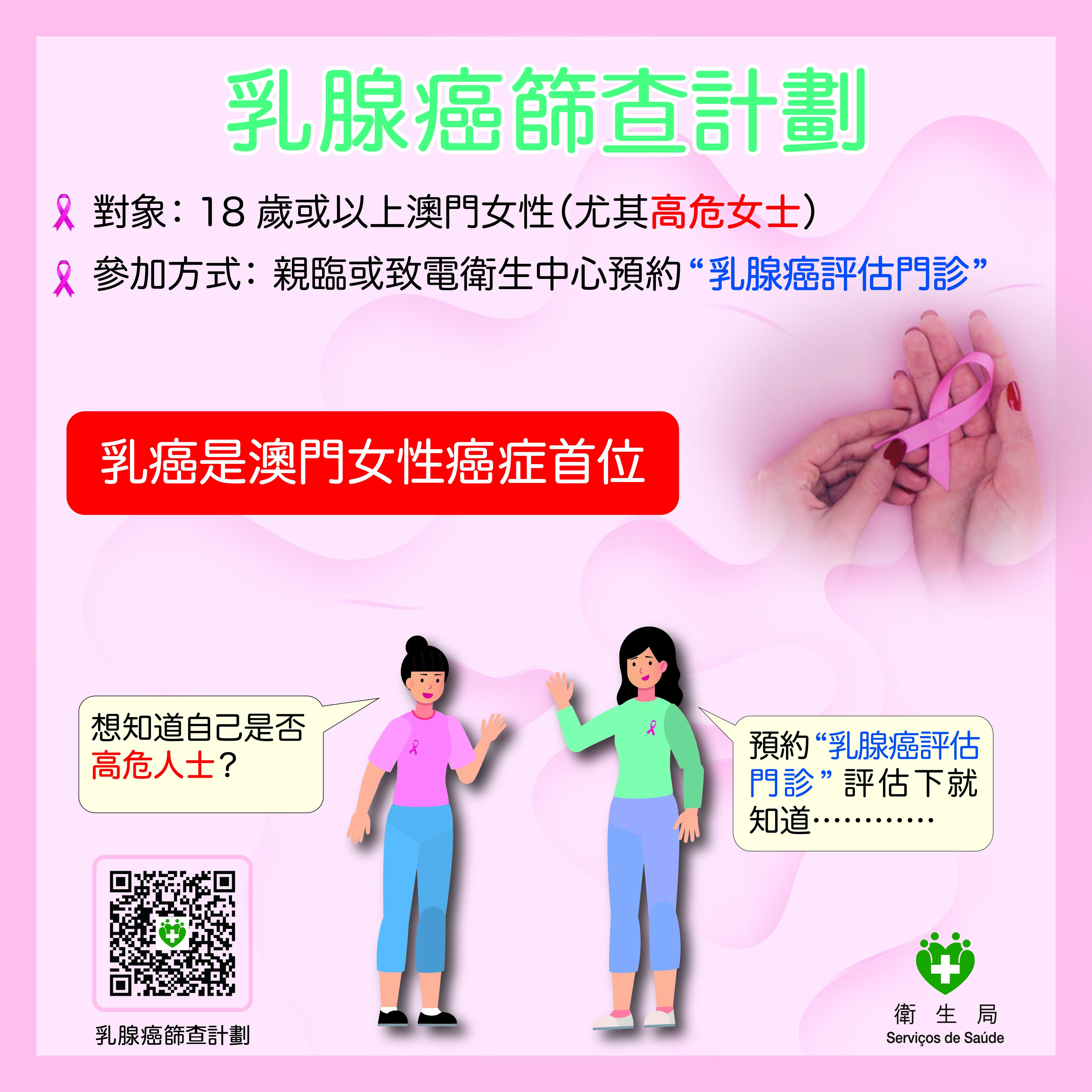 卫生局表示,乳腺癌和子宫颈癌为澳门女性常见的癌症,早期症状多不明显,难以察觉,定期筛查可及早发现癌前病变或早期癌症,实现“早预防、早发现、早诊治”的目标,大幅提升治疗效果及存活率,降低癌症死亡风险。居民可通过“一户通”内“我的健康”的“综合癌症筛查平台”进行风险评估,系统会根据个人的年龄、性别和问卷评估结果等,提出个体化的癌症筛查建议,并可在“平台”实现一站式预约子宫颈癌、大肠癌、乳腺癌和肺癌等主要癌症筛查服务及获取更多相关资讯。而保持健康生活方式,包括健康饮食、规律运动、戒烟限酒及充足睡眠等,可有效降低罹患各类癌症的风险。