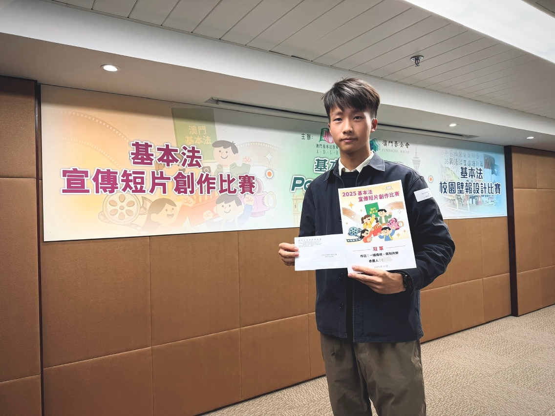 澳门大学社会科学学院传播系学生伍珈毅于“2025基本法宣传短片创作比赛”中夺得冠军,其短片作品《一国为根.两制共荣》以影像语言呈现《中华人民共和国宪法》、《澳门特别行政区基本法》及《维护国家安全法》的核心精神,展现澳门在“一国两制”护航下持续繁荣稳定的深层力量。