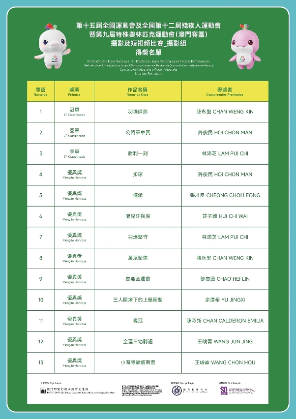 为响应“第十五届全国运动会及全国第十二届残疾人运动会暨第九届特殊奥林匹克运动会(澳门赛区)”(下称“十五运会及残特奥会”)在澳门特别行政区举办赛事,由文化局与十五运会及残特奥会澳门赛区筹备办公室联合主办、澳门摄影学会协办的“十五运会及残特奥会”摄影及短视频比赛已圆满结束,比赛收到约200份参赛作品,经评审团评选,现公布冠军、亚军、季军及优异奖得奖名单。