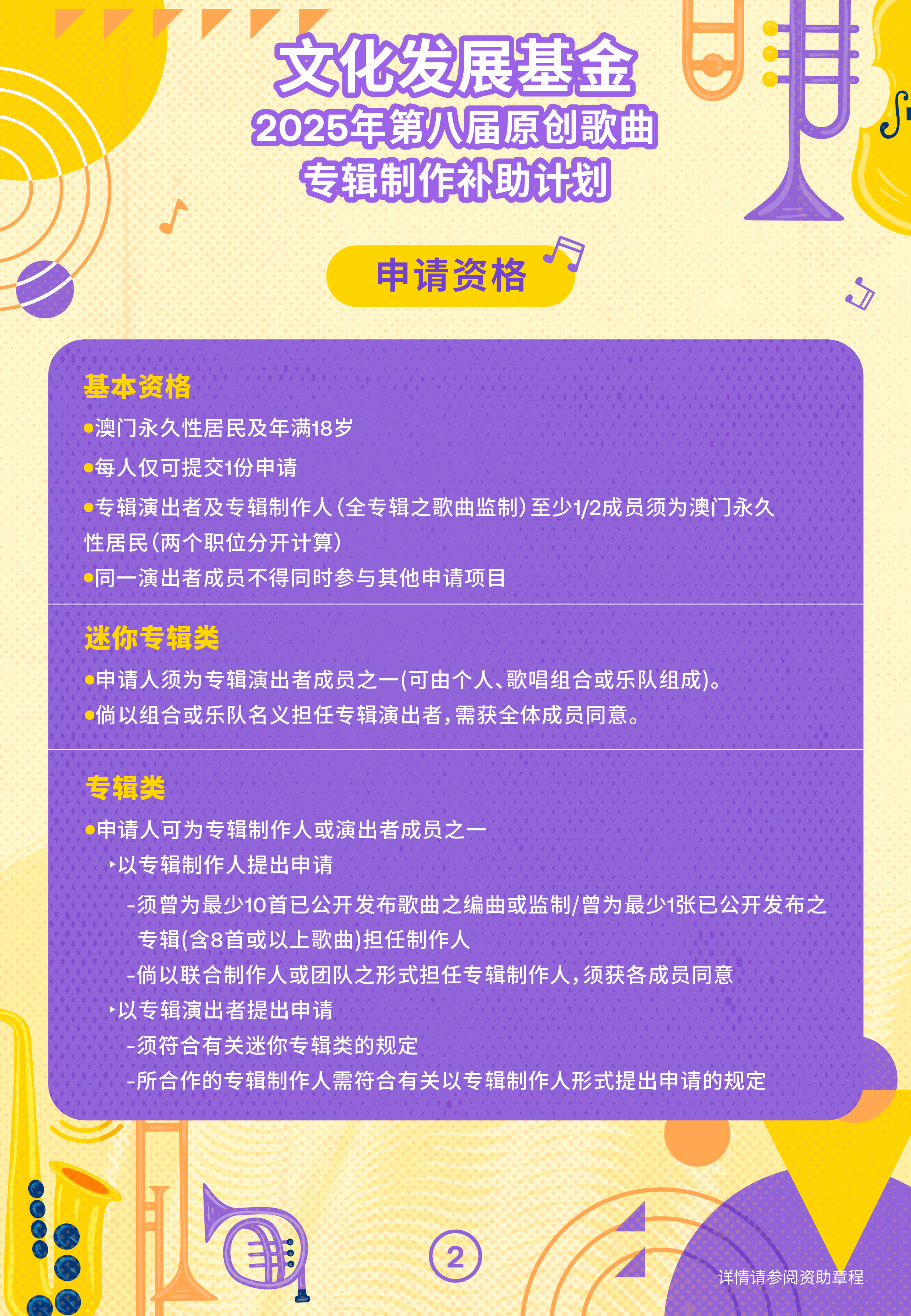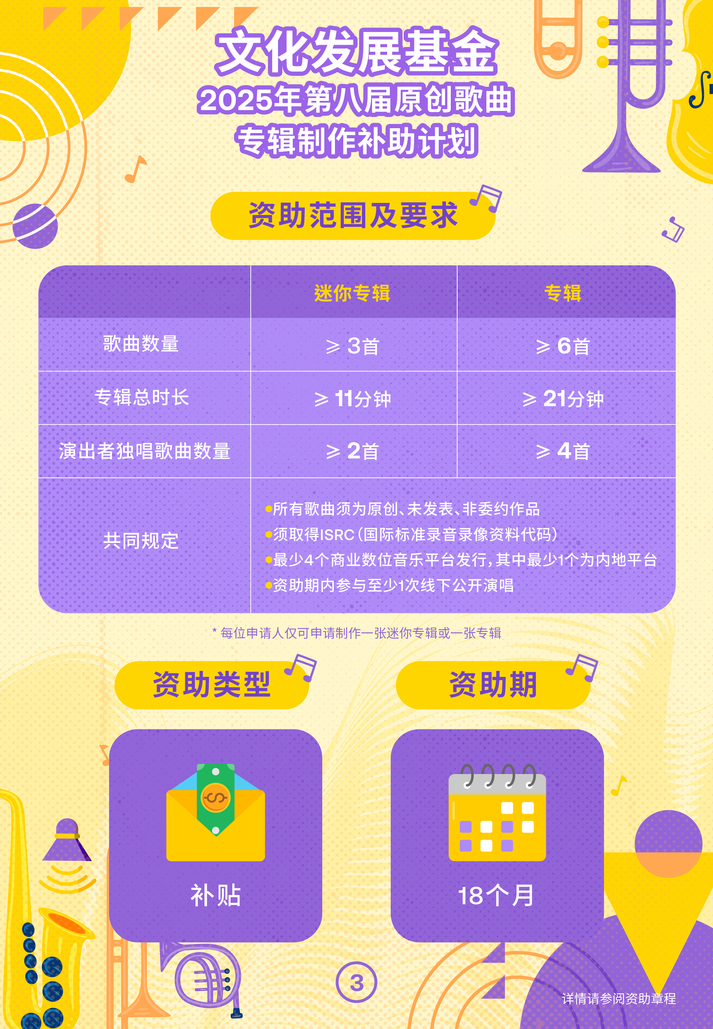 “第八届原创歌曲专辑制作补助计划”申请期由2025年12月31日至2026年2月13日。资助类型分为“迷你专辑”及“专辑”两类,不包括合辑及精选辑。所有歌曲须为未曾发表及演出的原创、非委约作品。“迷你专辑”须包含至少3首歌曲,“专辑”则须至少6首。受资助专辑必须于最少4个商业数位音乐平台发行,其中至少1个须为内地平台,并需参与至少1次线下公开演唱,演出受资助专辑内至少1首歌曲。每一申请人仅限申请制作一张迷你专辑或一张专辑。