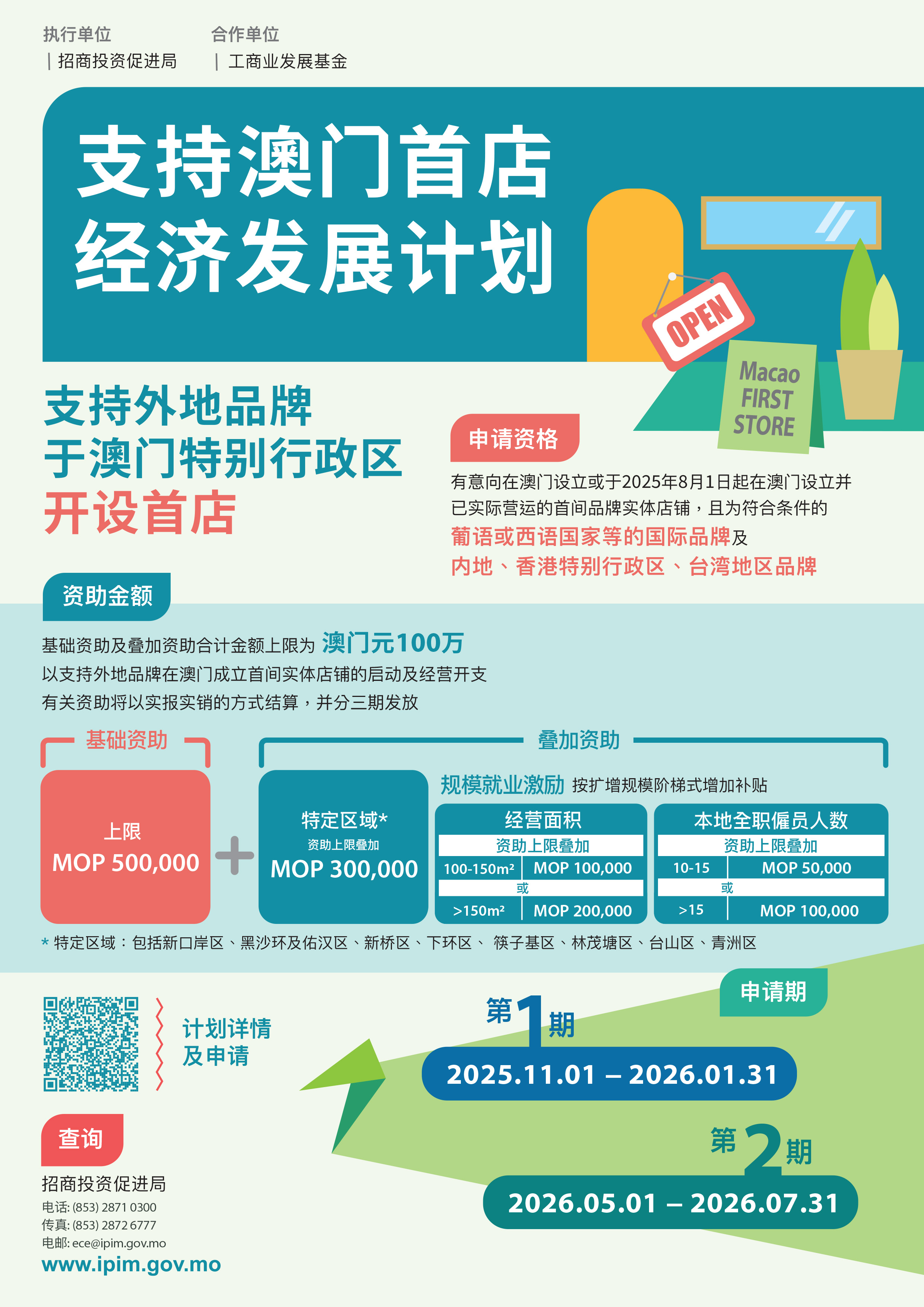 有关“首店经济计划”的详情,可浏览澳门招商局网站(https://www.ipim.gov.mo/ )或扫描宣传海报二维码,亦可于办公时间致电(853)2871 0300或电邮至ece@ipim.gov.mo向澳门招商局查询。