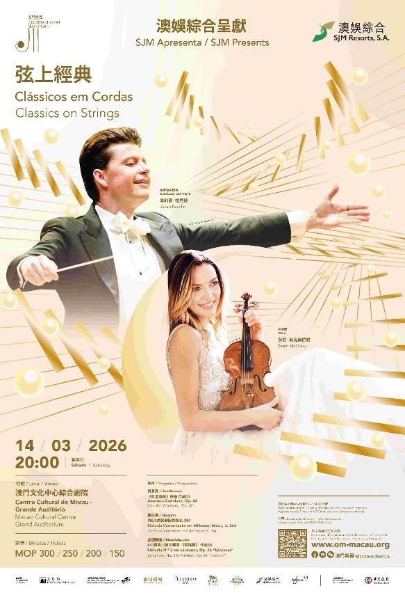 文化局、澳门乐团有限公司与澳娱综合度假股份有限公司将于3月14日(周六)晚上8时,在澳门文化中心综合剧院携手呈献《弦上经典》音乐会。国际着名小提琴家朱利安‧拉克林将同时担任指挥,并联袂中提琴家莎拉‧麦克尔拉维与澳门乐团,演出贝多芬《科里奥兰》序曲、莫扎特《降E大调交响协奏曲》及孟德尔逊A小调第三号交响曲《苏格兰》,共同献上一场旋律优美动人的弦乐盛宴。