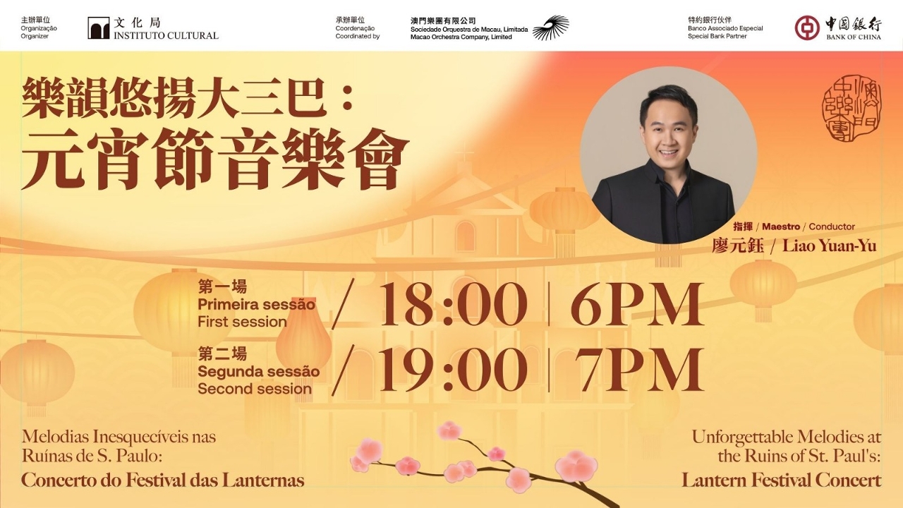 由文化局主办、澳门乐团有限公司承办的“乐韵悠扬大三巴”元宵节音乐会,将于3月3日傍晚6时及7时在世界遗产景点大三巴牌坊上演,由澳门中乐团演绎多首充满节庆气氛的中乐名曲与流行作品,与观众欢度元宵佳节。音乐会免费入场,每场演出为30分钟,观众需遵从现场指示安排入座。