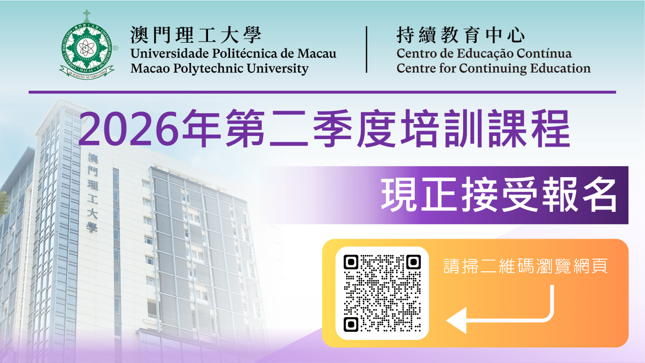 澳门理工大学持续教育中心将于2026年第二季度开办一系列专业培训课程,范畴涵盖公共行政、商业应用及企业管理、社工及护理实务、语言及传意、科技及工程应用、青少年培养、艺术及设计等领域,更首次开办“体适能基础证书课程”及“全方位婚宴主持技巧”专业培训。课程现正接受报名,欢迎报读。