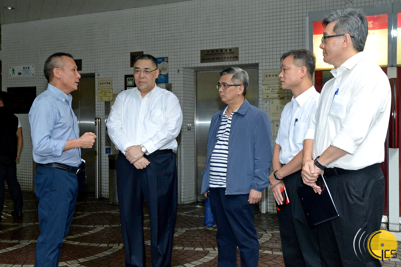 行政長官崔世安到下環街市附近視察風後的市面情況,聽取區內善後工作的匯報。