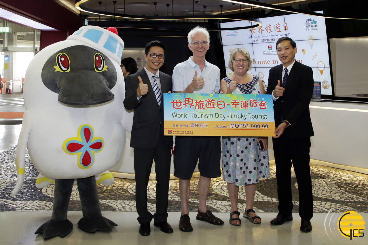 旅遊局舉辦慶祝“世界旅遊日”活動 - 旅遊局副局長程衛東和許耀明在外港碼頭向幸運旅客致送紀念品