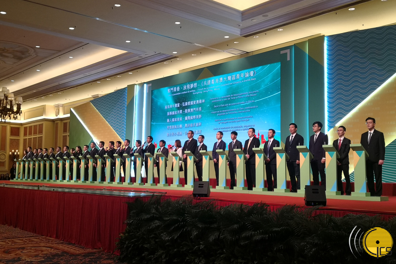30名本澳青年代表在“奮鬥青春、放飛夢想—共建粵港澳大灣區青年論壇”開幕式上簽署並宣讀《澳門青年投身大灣區建設倡議》。