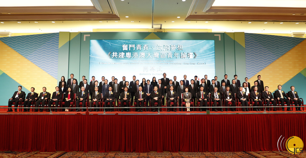 行政長官崔世安、全國政協副主席何厚鏵和國務院港澳辦公室主任張曉明等嘉賓在“奮鬥青春、放飛夢想—共建粵港澳大灣區青年論壇”開幕式上,與粵港澳大灣區各城市的政府和青年代表合影。