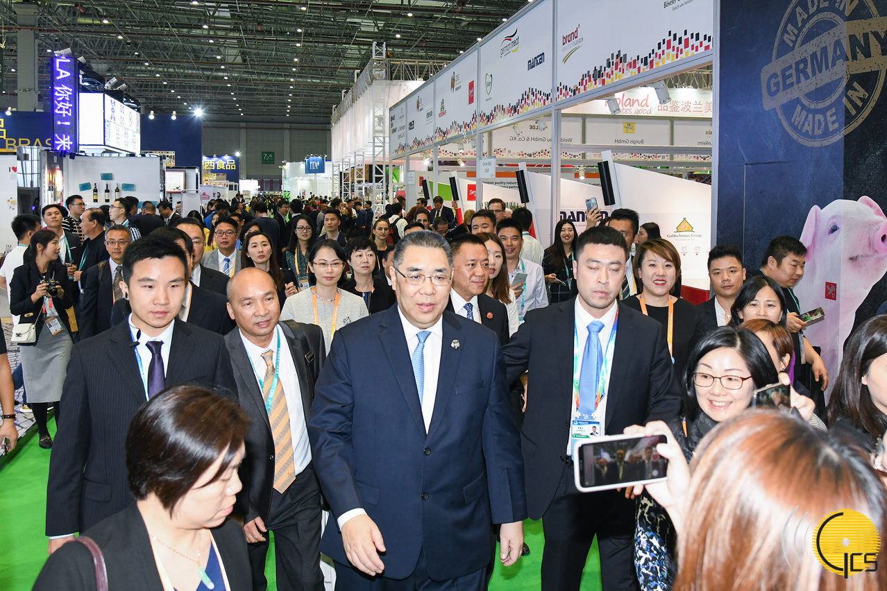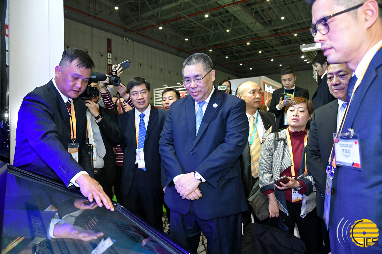 正在上海的行政長官崔世安巡視澳門貿易投資促進局於首屆中國國際進口博覽會“貨物貿易-食品及農產品展區”內設置的澳門企業展館。