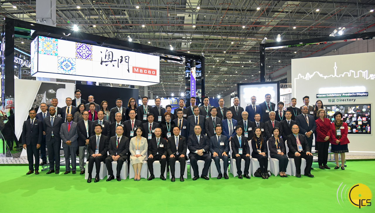 行政長官崔世安與澳門企業家代表團,在首屆中國國際進口博覽會“貨物貿易-食品及農產品展區”內的澳門企業展館前合影。