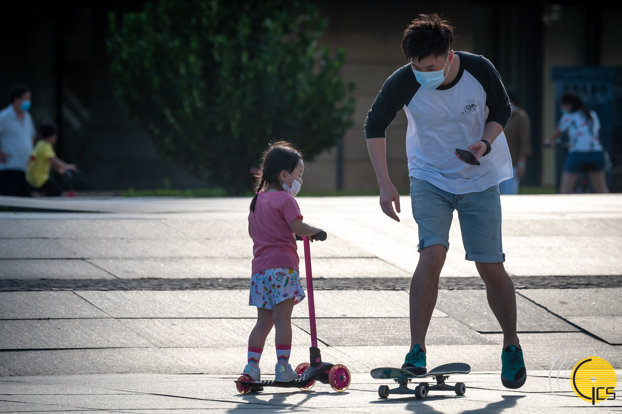 有家長帶子女到空曠地方遊玩,呼吸新鮮空氣。