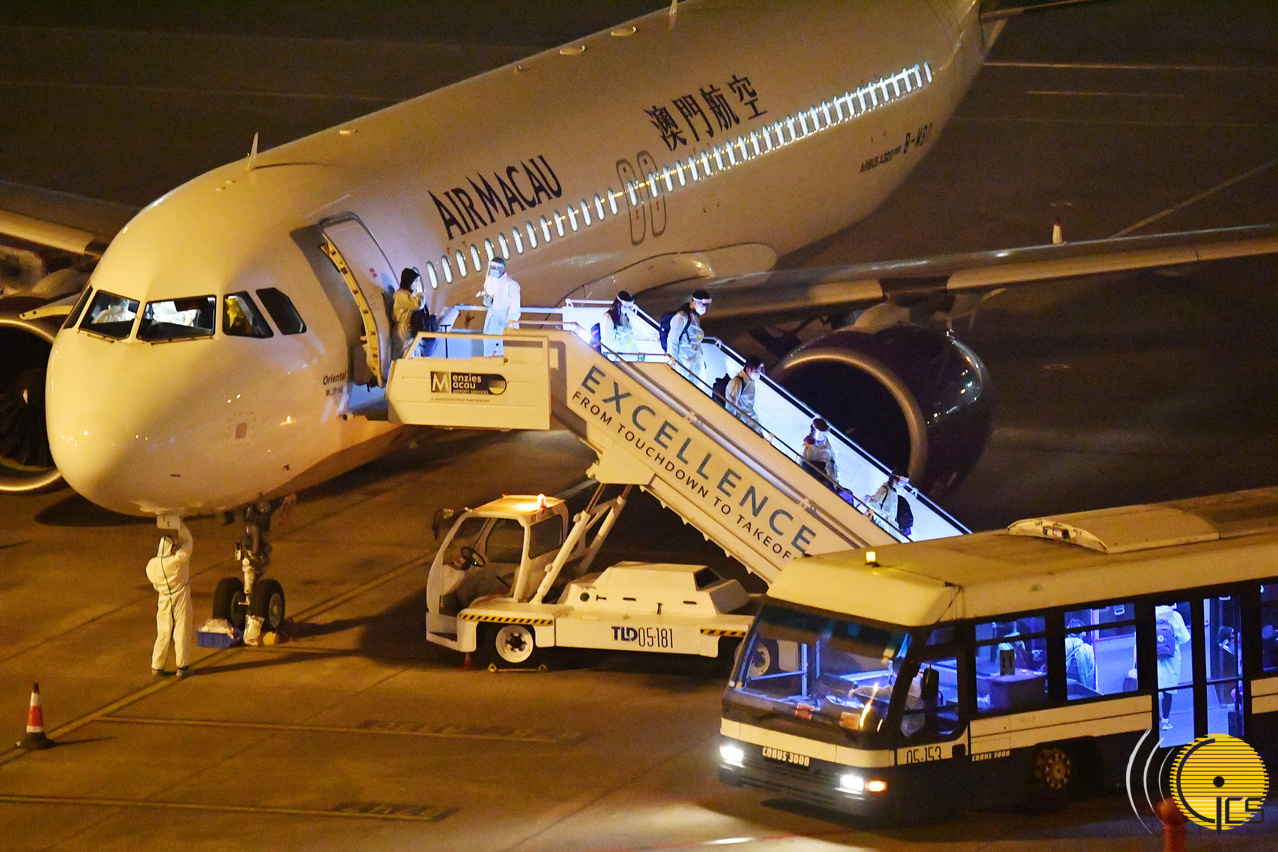 澳門居民分批下飛機,特區政府在各個環節皆採取嚴格措施,包括閉環管理及即時對全體抵澳人員進行核酸檢測。