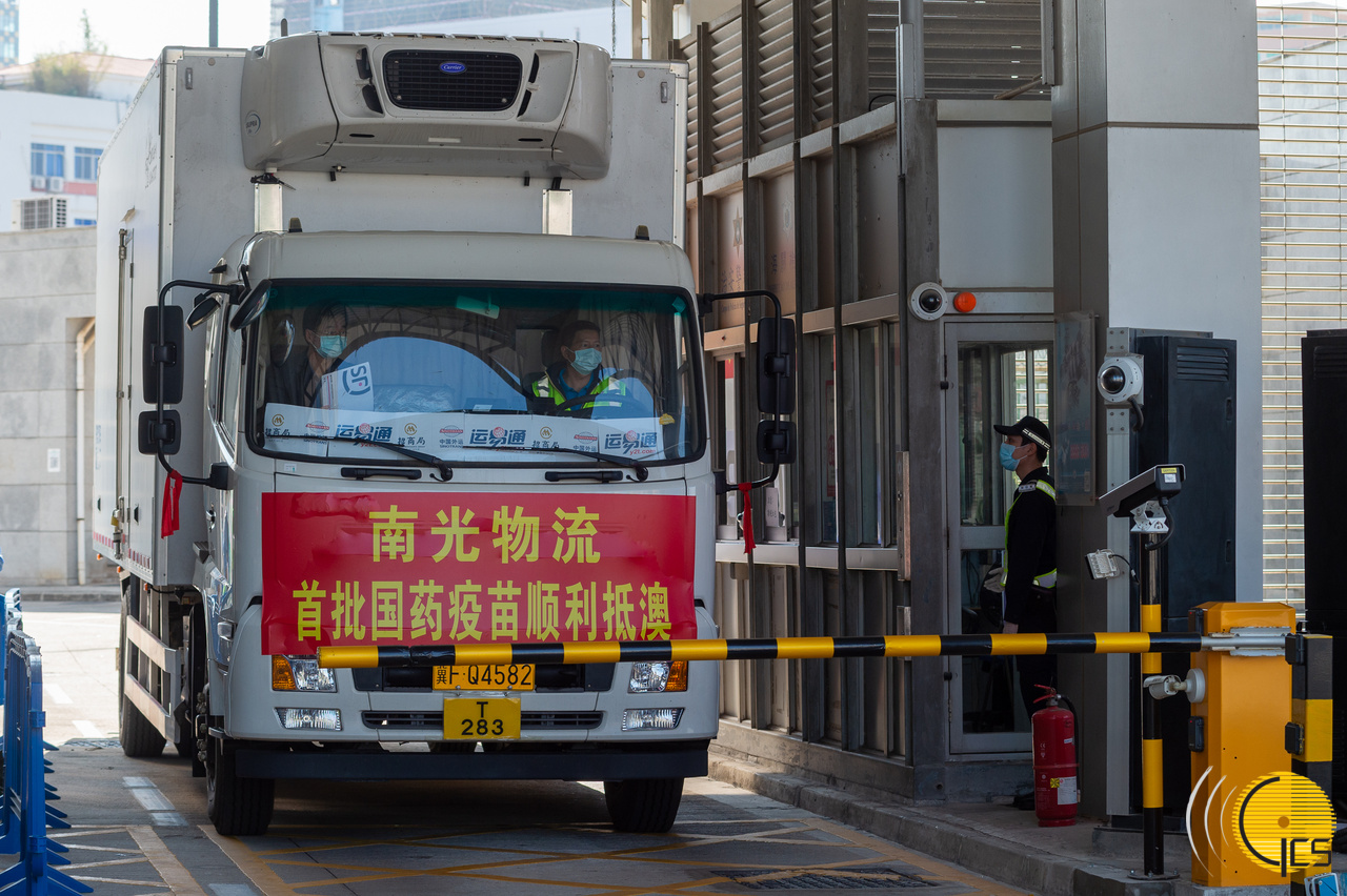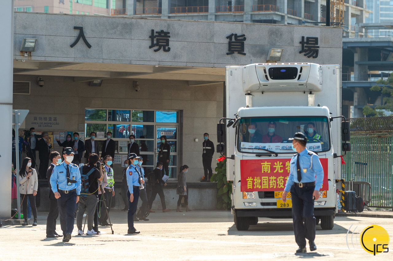 首批由國藥集團生産的新型冠狀病毒滅活疫苗今早運抵珠澳跨境工業區口岸