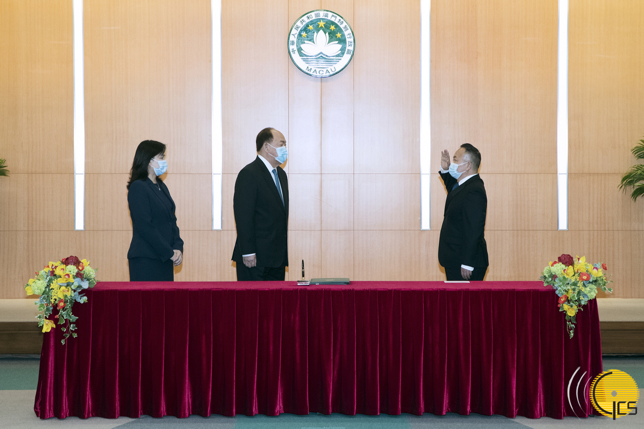在行政長官賀一誠監誓下,政策研究及區域發展局局長張作文宣誓就職。行政長官辦公室主任許麗芳見證。