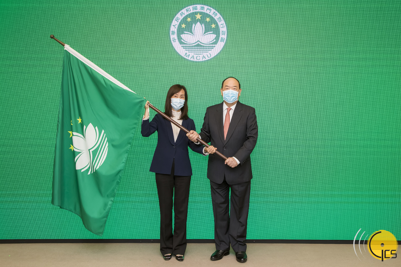 參加“第十四屆全國運動會”的澳門特區體育代表團向行政長官賀一誠辭行,獲得行政長官勉勵並授予澳門特區區旗。